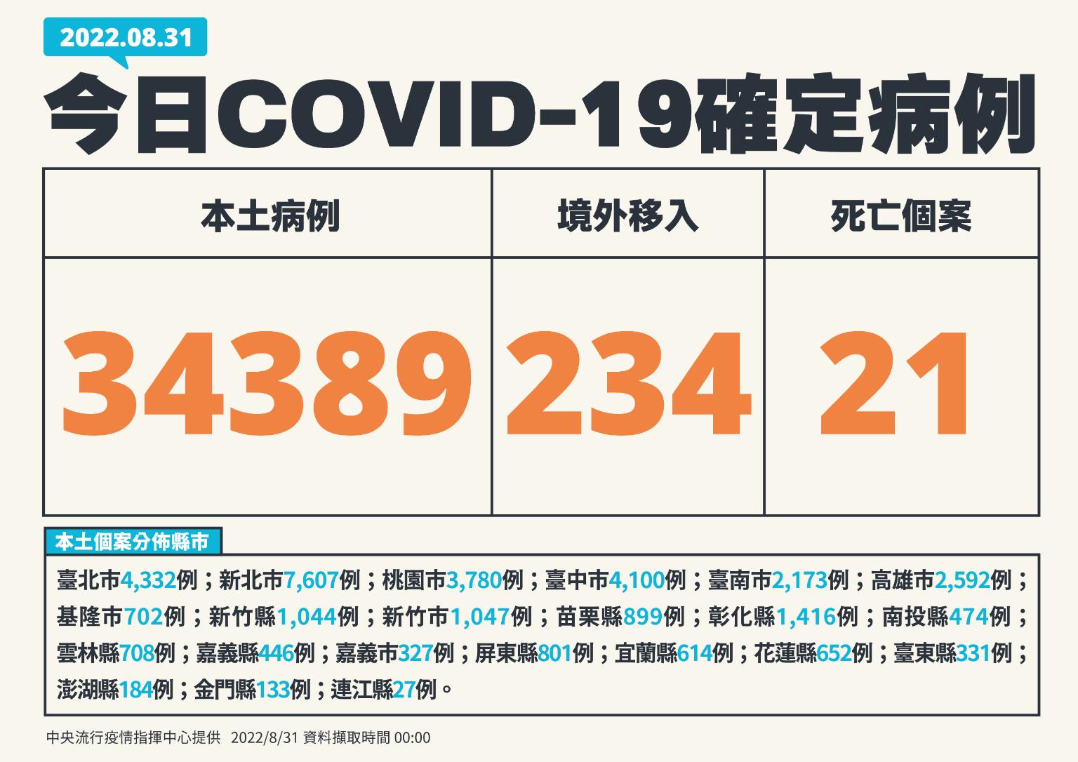 中央流行疫情指揮中心今(31)日公布國內新增34,623例COVID-19確定病例,分別為34,389例本土個案及234例境外移入;另確診個案中新增21例死亡。