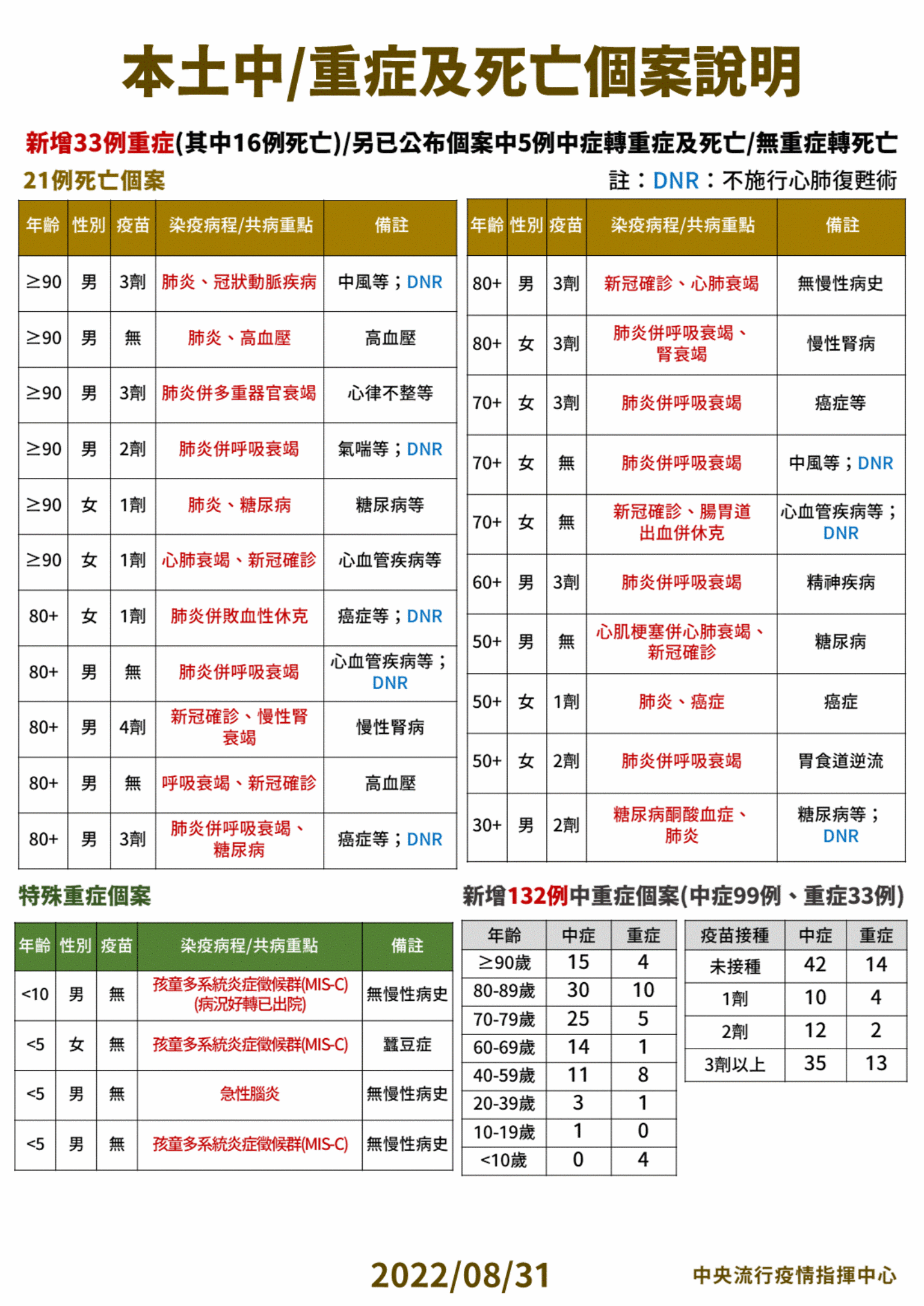 指揮中心指出,今日新增21例本土病例死亡個案,為12例男性、9例女性,年齡介於30多歲至90多歲以上,皆屬重度感染、20例具慢性病史、13例未接種3劑以上COVID-19疫苗。確診日介於今(2022)年5月23日至8月27日,死亡日期介於6月12日至8月28日,詳如新聞稿附件。