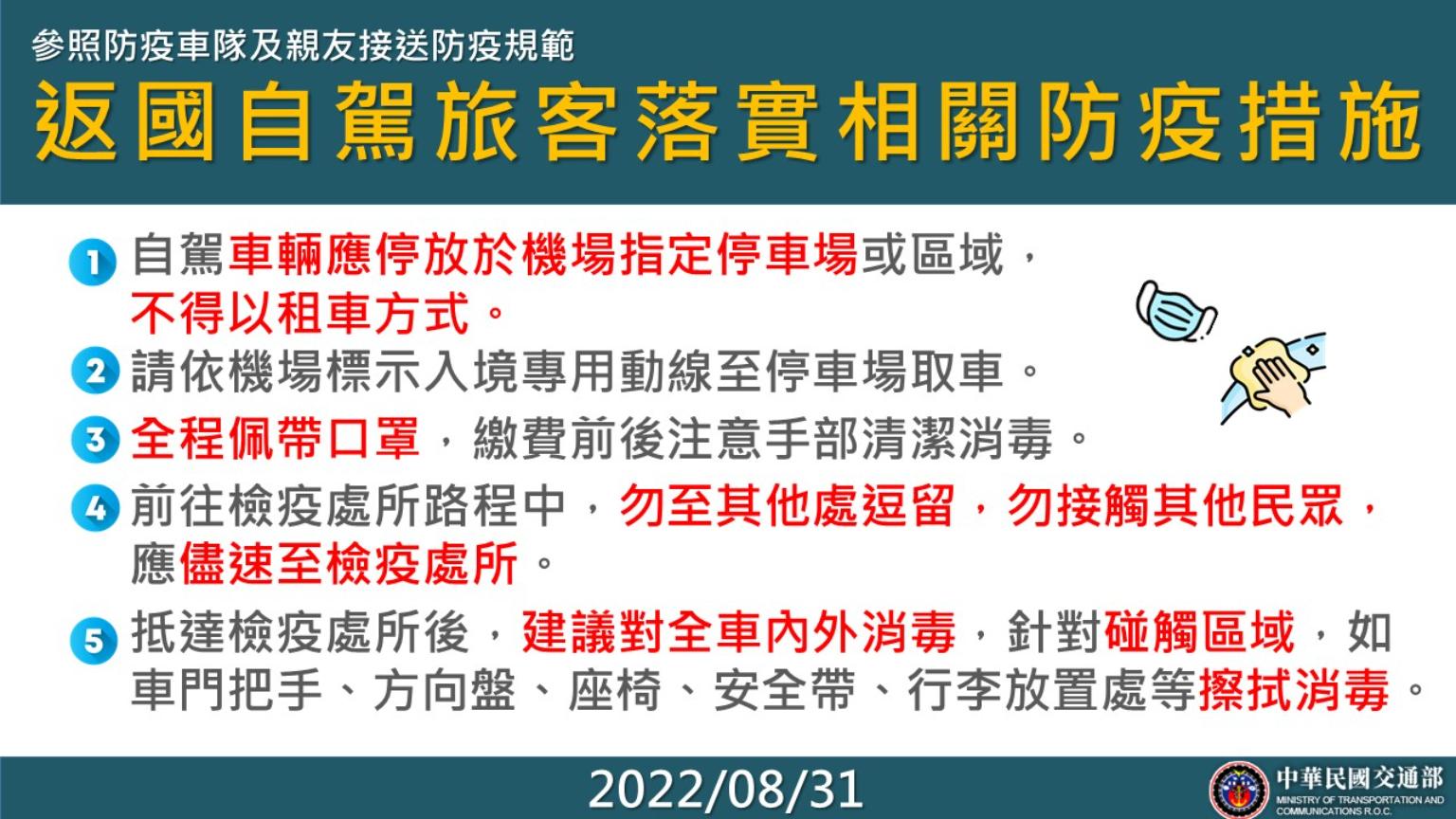 9月1日起,開放入境旅客可自行駕車前往檢疫處所,請返國欲自行開車前往檢疫處所之旅客務必遵守中央流行疫情指揮中心所訂之各項防疫規範,依機場指定動線至停車場取車,並儘速至檢疫處所,共同嚴守社區防線。