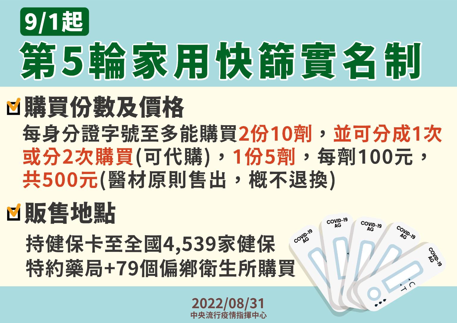 指揮中心說明,為因應民眾購買平價之家用抗原快篩試劑需求,指揮中心於今年4月28日推出家用抗原快篩試劑實名制,依循口罩實名制1.0於健保特約藥局及衛生所通路販售,凡是持有健保卡或居留證之民眾,均可至藥局及衛生所購買,每輪每位民眾可購買1份5劑,每份售價500元(醫材原則售出,概不退換);第二輪於6月6日開始實施,每個販售據點每天配送份數由78份增為117份,並自6月13日起,取消單雙號的購買限制,民眾可自行依需求選擇購買日期,提升購買之方便性;第三輪於7月1日開始實施,每輪每位民眾維持購買1份5劑;第四輪於8月15日開始實施,每輪每位民眾購買數量由原先1份(5劑),增加至多可購買2份(10劑),並可分成1次或2次購買(可代購)。