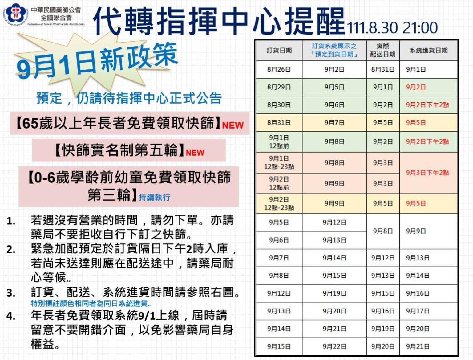 指揮中心表示,除快篩試劑實名制外,8月15日起已開始實施第三輪 0-6歲學齡前幼兒免費領取快篩試劑,領取資格仍為2015年9月2日(含)以後出生的學齡前孩童;另9月1日起亦開放65歲以上(1957年(含)以前出生)長者免費領取快篩試劑,民眾可持尚未領取孩童或9月1日起持65歲以上長者的健保卡,至各快篩實名制販售據點免費領取一份5劑家用快篩試劑,此免費領取份數,不會計入家用抗原快篩試劑實名制的購買資格。