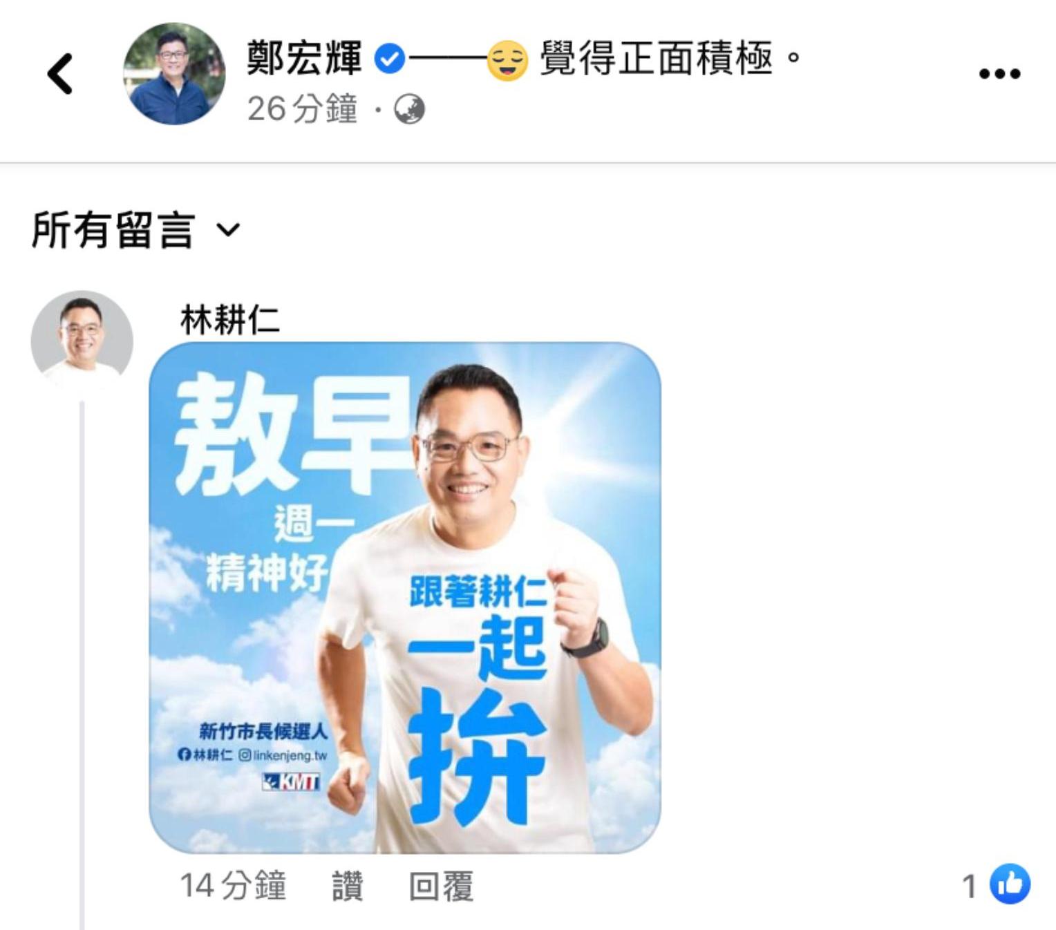 對於林耕仁稱要「進步、對話」,地方解讀其實是要跟民主「進步」黨「對話」,且林耕仁6屆議員資歷,當中有3屆都跟民進黨執政的市府一起,共同為新竹市民打拼,包括前市長蔡仁堅與林智堅,彼此都有相處的經驗。值得注意的是,林耕仁日前也主動到前立委鄭宏輝的臉書上道早安,展現他的圓融特質。