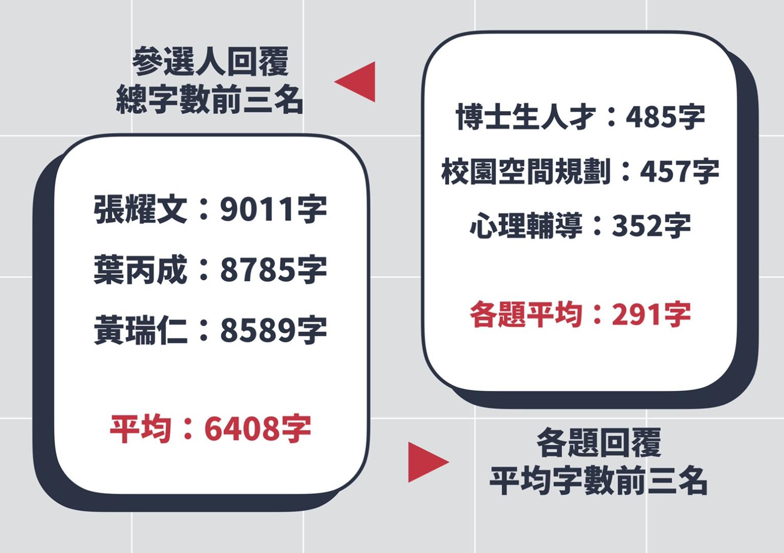 不過,他也強調,字數的多寡可以看得出參選在回覆學生問題上耗費時間多寡,但也僅供參考,實際仍要檢視各參選人回覆的詳細內容,判斷的標準包含是否「同理/理解問題」、有無「願景及解決方式」等兩個面向,來評斷參選人的答覆表現。