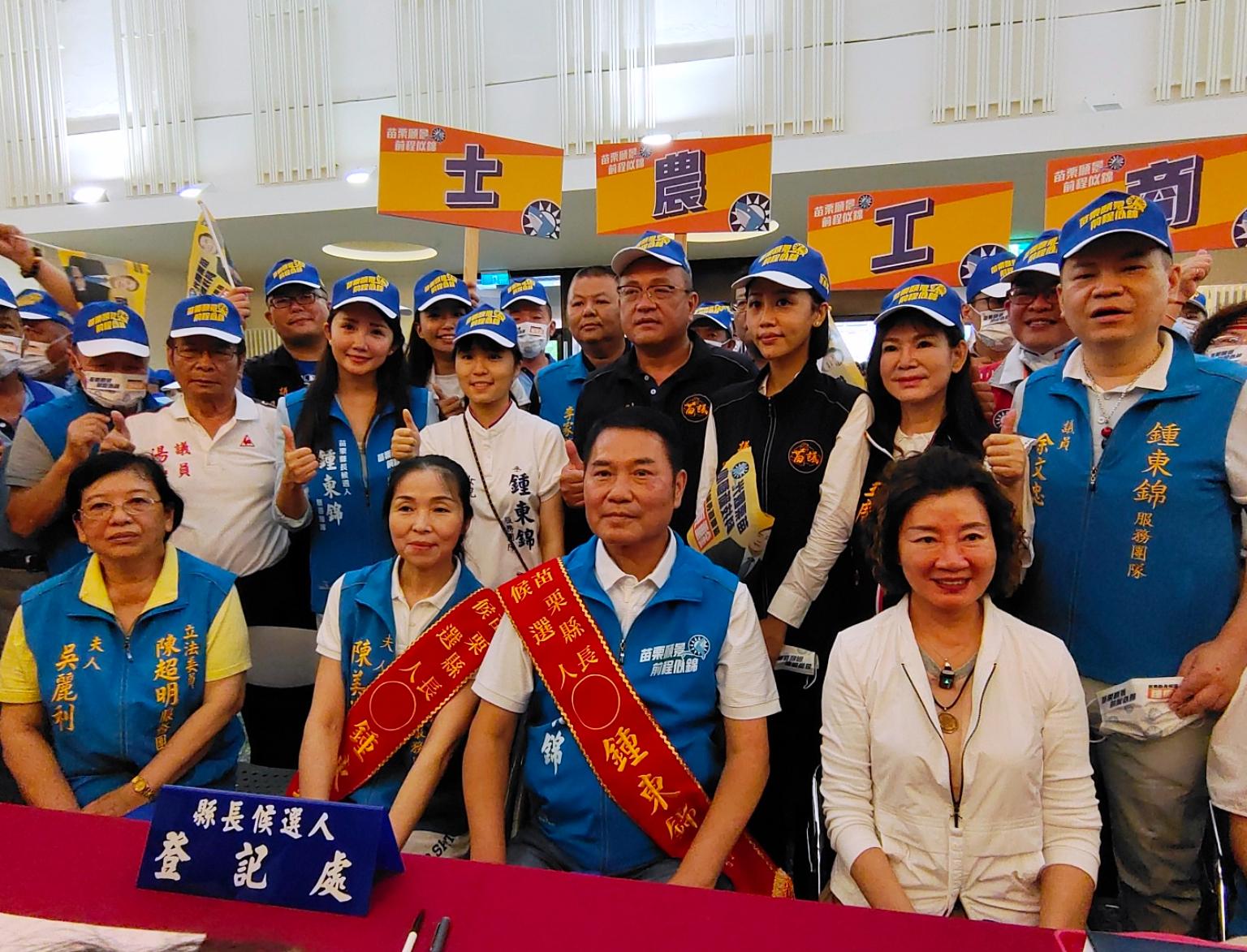 繼昨天國民黨苗栗縣長提名人謝福弘登記參選後,現任議長鍾東錦今(2)日也登記參選,並且獲得縣長徐耀昌夫人蔡麗卿、立委陳超明夫人吳麗利到場相挺。