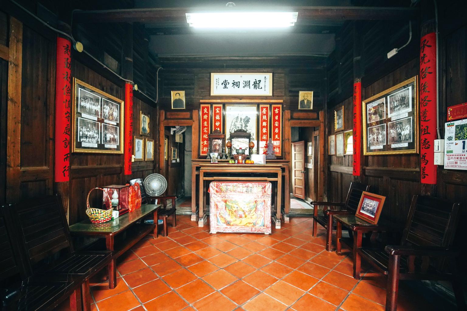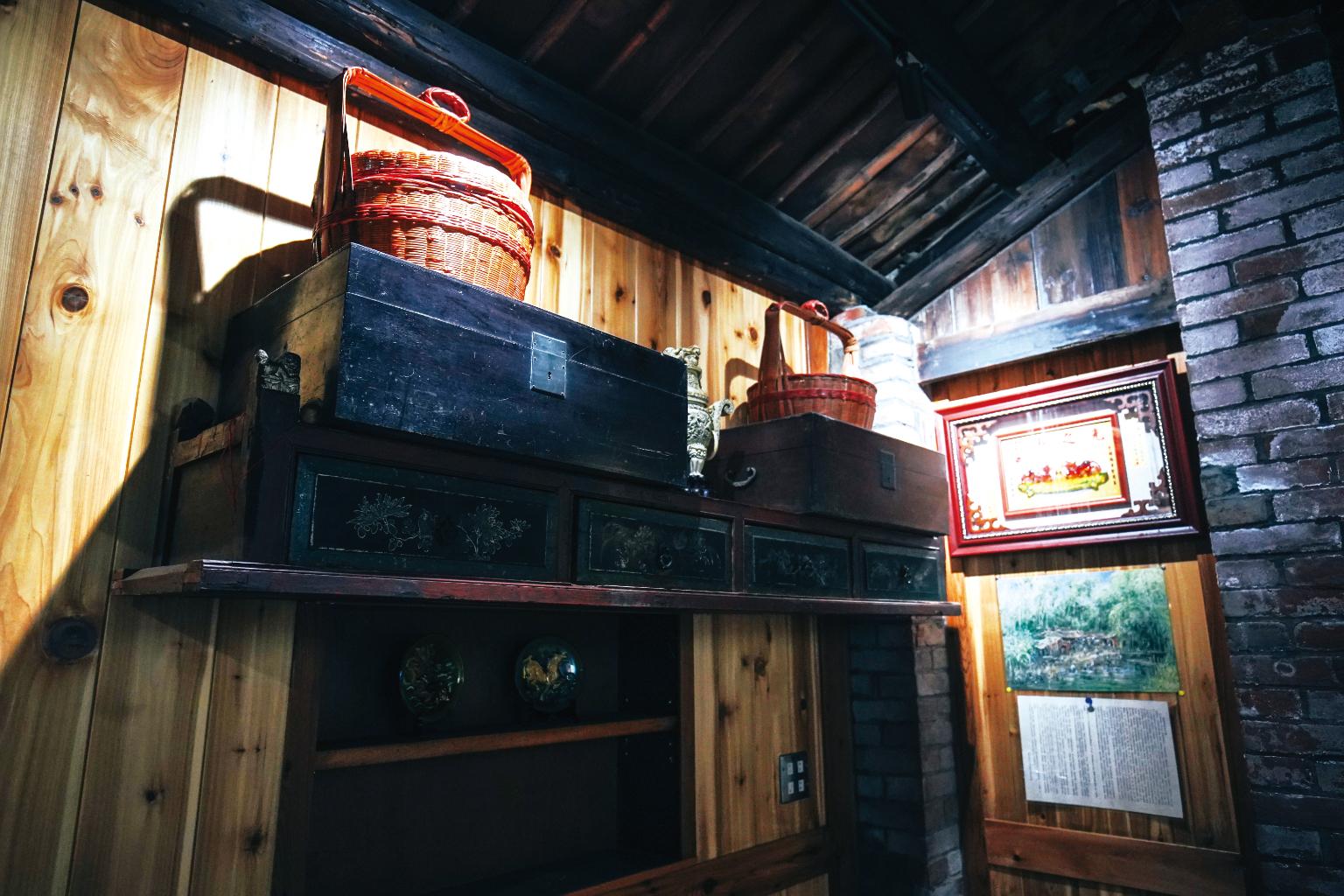 走入北頭文化館的正廳,抬頭可見屋樑仍保有福州杉樑木及穿斗式的構造,側邊的木架上,擺放的物品都是經過蔡槐澤細心的揀選與整理,將這些具歲月溫度的生活器具魚貫排列展現,讓參觀者能夠了解到更多老屋的空間樣貌。