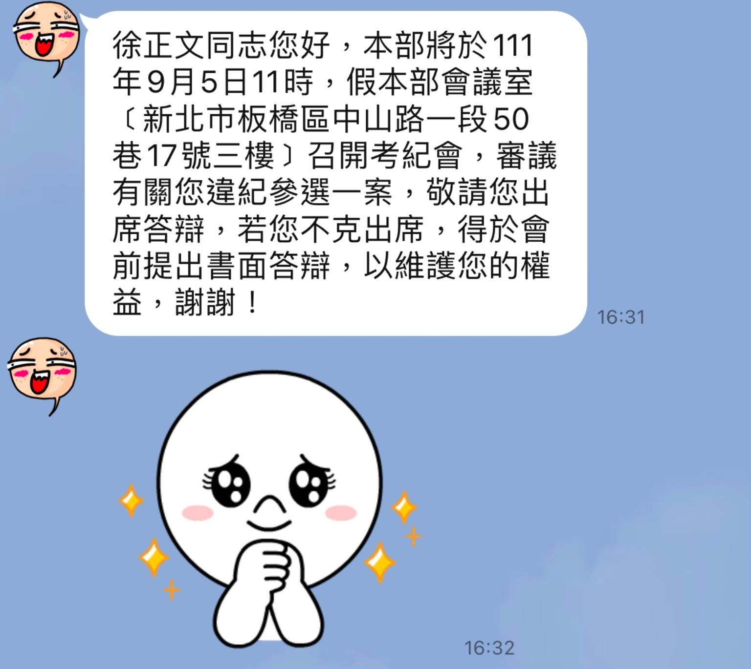 徐正文指出,他已經收到黨部通知,9月5日上午11時召開考紀會,並邀請他出席答辯或提出書面答辯。徐正文告訴《信傳媒》,一旦被黨紀處分,一定會採取相應的法律程序。他並強調:「國民黨若覺得我不強,那根本不用擔心我選!」