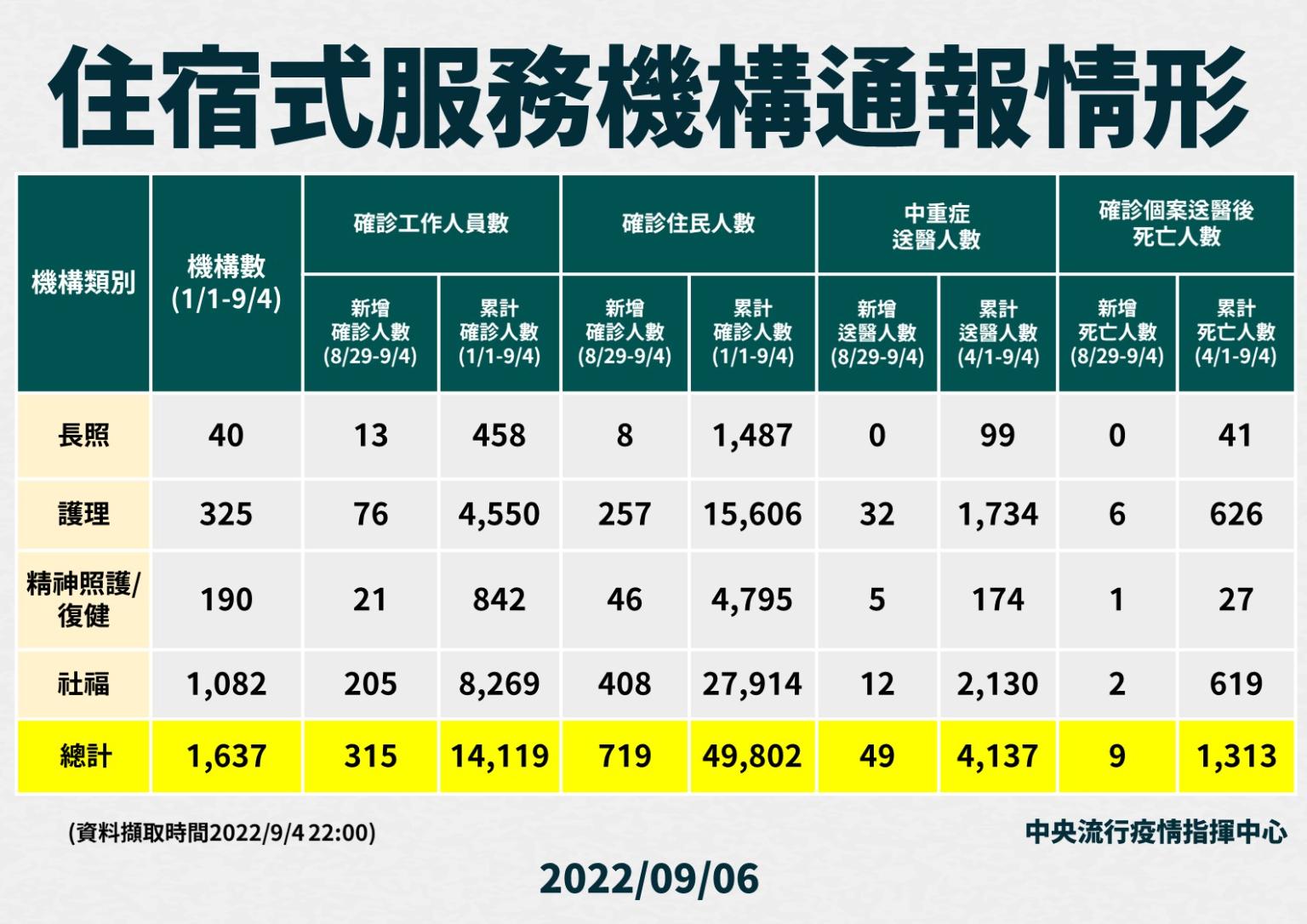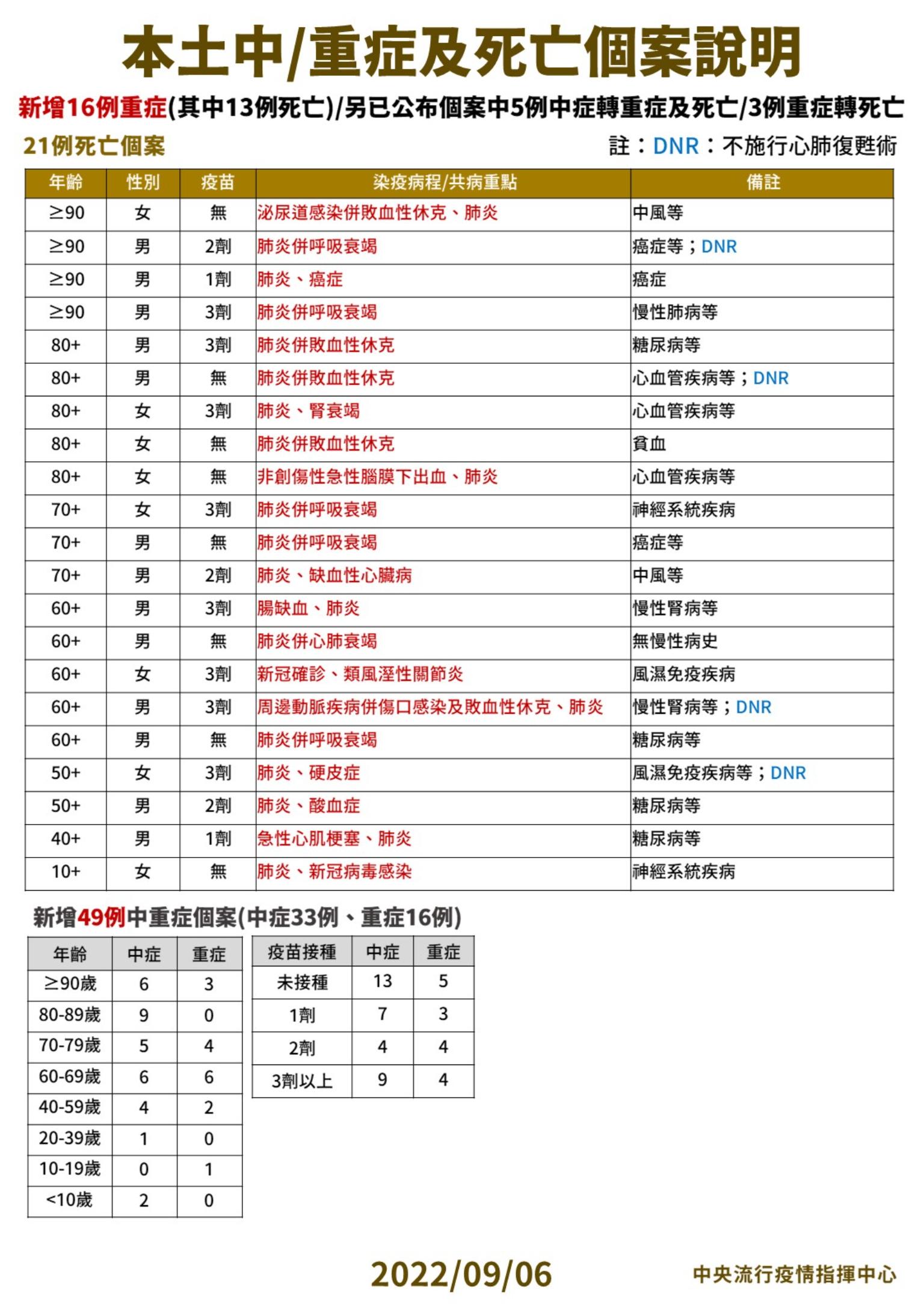 指揮中心指出,今日新增21例本土病例死亡個案,為13例男性、8例女性,年齡介於10多歲至90多歲以上,皆屬重度感染、20例具慢性病史、13例未接種3劑以上COVID-19疫苗。確診日介於今(2022)年7月4日至9月3日,死亡日期介於8月25日至9月3日,詳如新聞稿附件。
