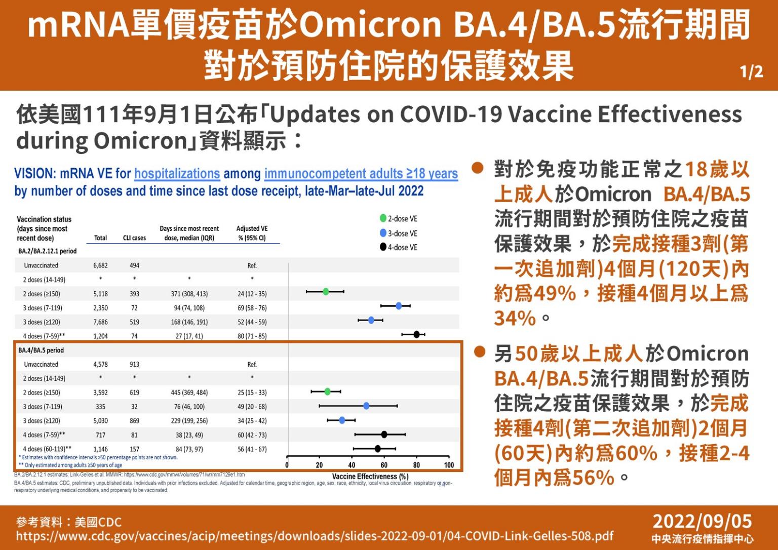 張上淳指出,根據資料顯示,雖二價疫苗沒有直接保護效果資訊,但參考BA.4或BA.5流行時,第一代疫苗對預防住院重症、死亡數據,可推估二價疫苗仍有很好的效果。並強調下一波疫情將至,鼓勵大家接種疫苗,可預防重症及死亡。