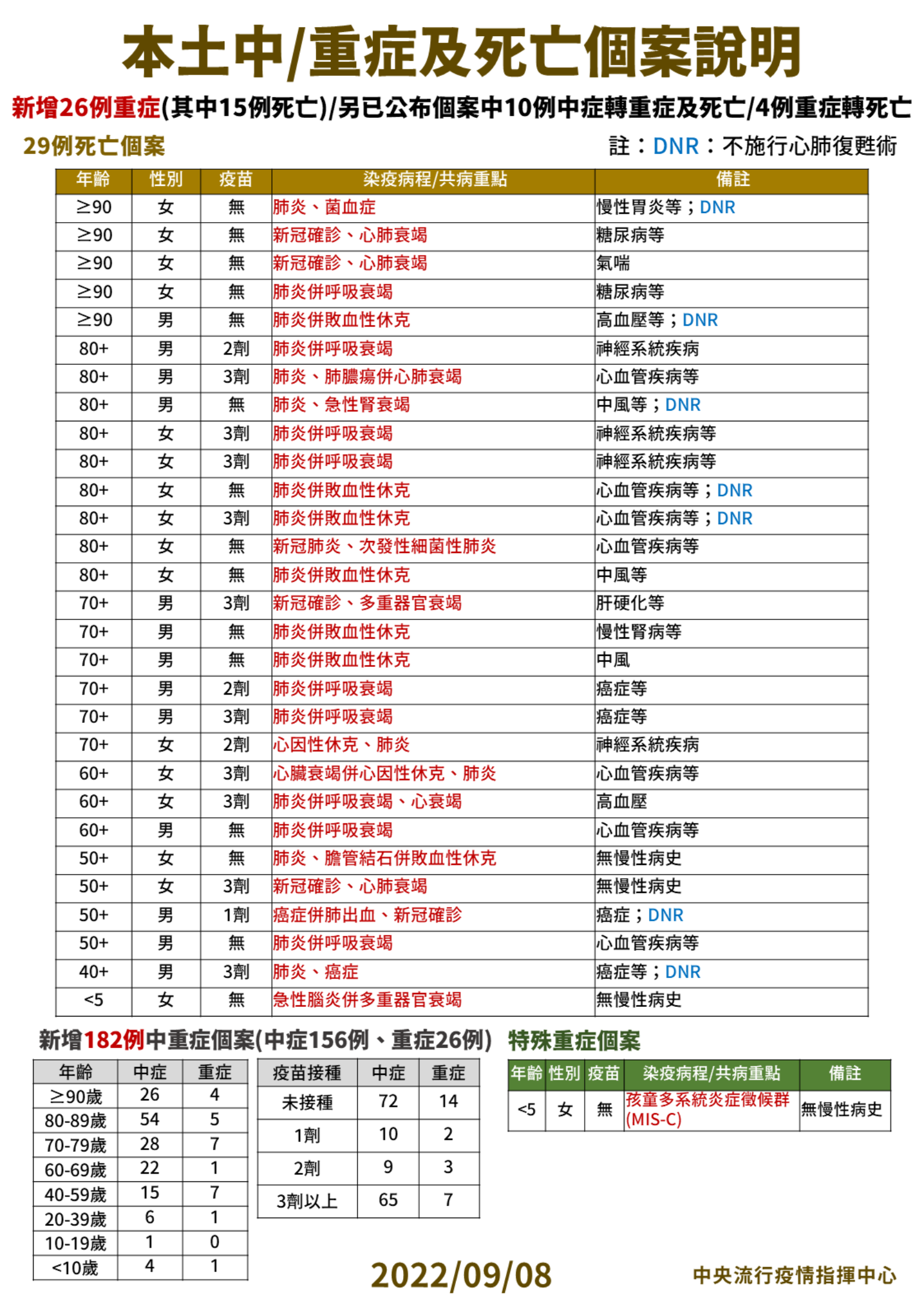 指揮中心指出,今日新增29例本土病例死亡個案,為13例男性、16例女性,年齡介於未滿5歲至90多歲以上,皆屬重度感染、26例具慢性病史、19例未接種3劑以上COVID-19疫苗。確診日介於今(2022)年5月28日至9月5日,死亡日期介於5月29日至9月5日。