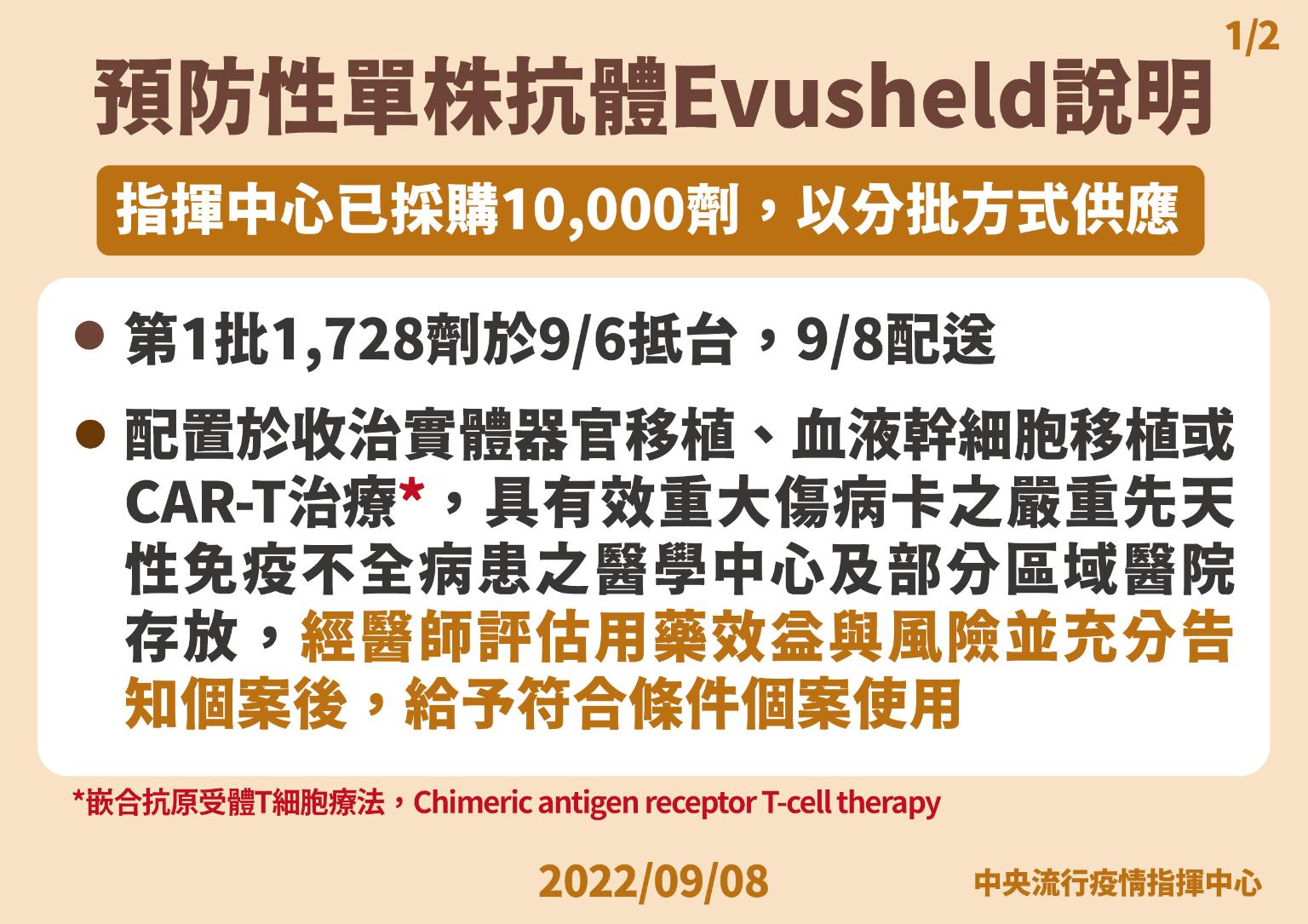 指揮中心指出,Evusheld為預防性單株抗體,為目前對Omicron BA.2、BA.2.12.1、BA.4及BA.5具療效之單株抗體組合之一,可用於暴露前預防,已取得美、法、英、澳及歐盟等多國緊急使用授權(Emergency Use Authorization,EUA),提供給無法接種疫苗或免疫功能低下的族群施打,以降低其染疫風險。疾管署已將其納入新型冠狀病毒(SARS-CoV-2)感染臨床處置指引之建議藥物,規劃配置於收治實體器官移植、血液幹細胞移植或CAR-T治療(嵌合抗原受體T細胞療法,Chimeric antigen receptor T-cell therapy),具有效重大傷病卡之嚴重先天性免疫不全病患之醫學中心及部分區域醫院存放,經醫師評估用藥之效益與風險並充分告知個案後,給予符合條件個案使用。