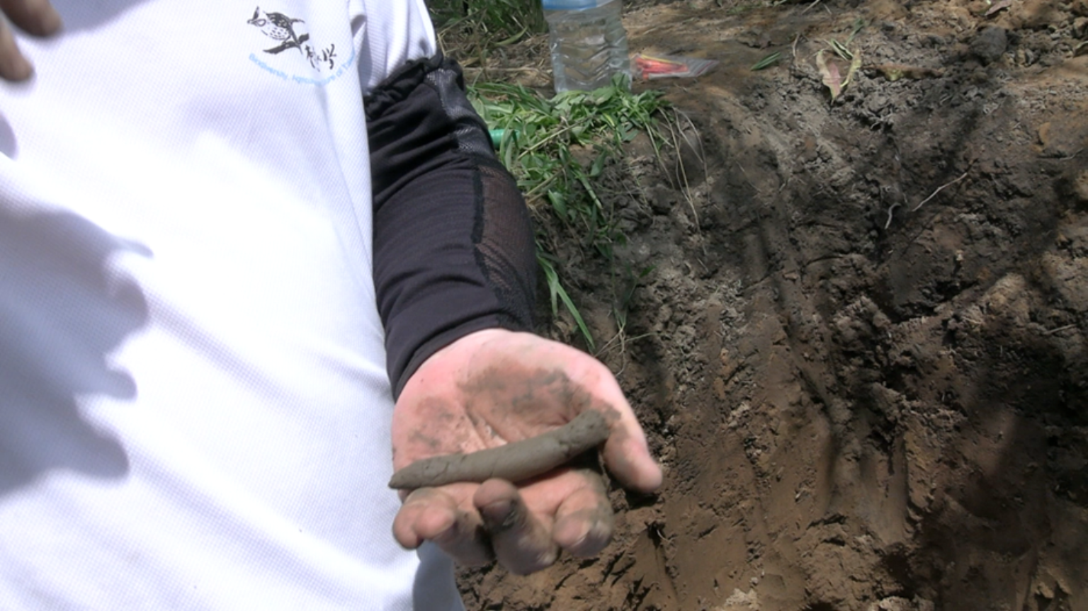 說著說著,陳尊賢就拿起一坨土,混了水,熟稔地在掌間搓揉出了一條土麵條,搓越長,這代表粘粒高,也意味著有比較高的有機質。