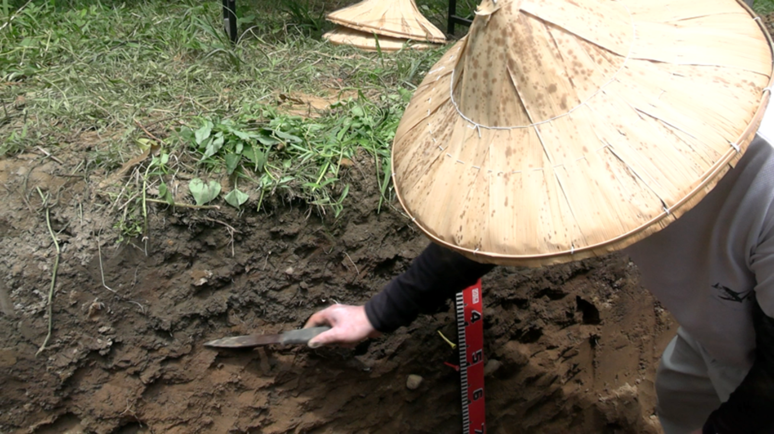 在15日的現場解說時,陳尊賢首先在1公尺深的土坑中說明土層的結構與可能性,「從下面的卵石來看,這裡的土壤與大甲溪有關,大甲溪在這裡的150公尺以下,地殼上升的結果,大約50萬年前在大甲溪河床,母岩風化,就變成土壤。」