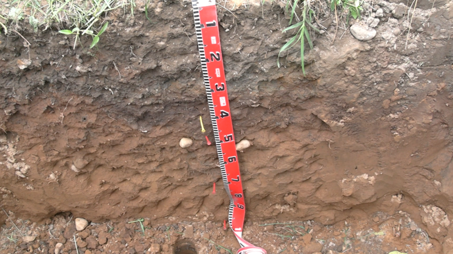 接著陳尊賢對開挖土坑的土壤分層解說,一般的土壤由母岩風化而成,形成水平漸層,他指著一條呈波浪形的層界,這代表還有其他力量在推動母岩風化的土壤層,這些力量包括地形、地震、暴雨等天然作用,也可能是樹木移除後形成的凹洞產生,進行土壤調查時,需要觀察細微並逐一記錄。