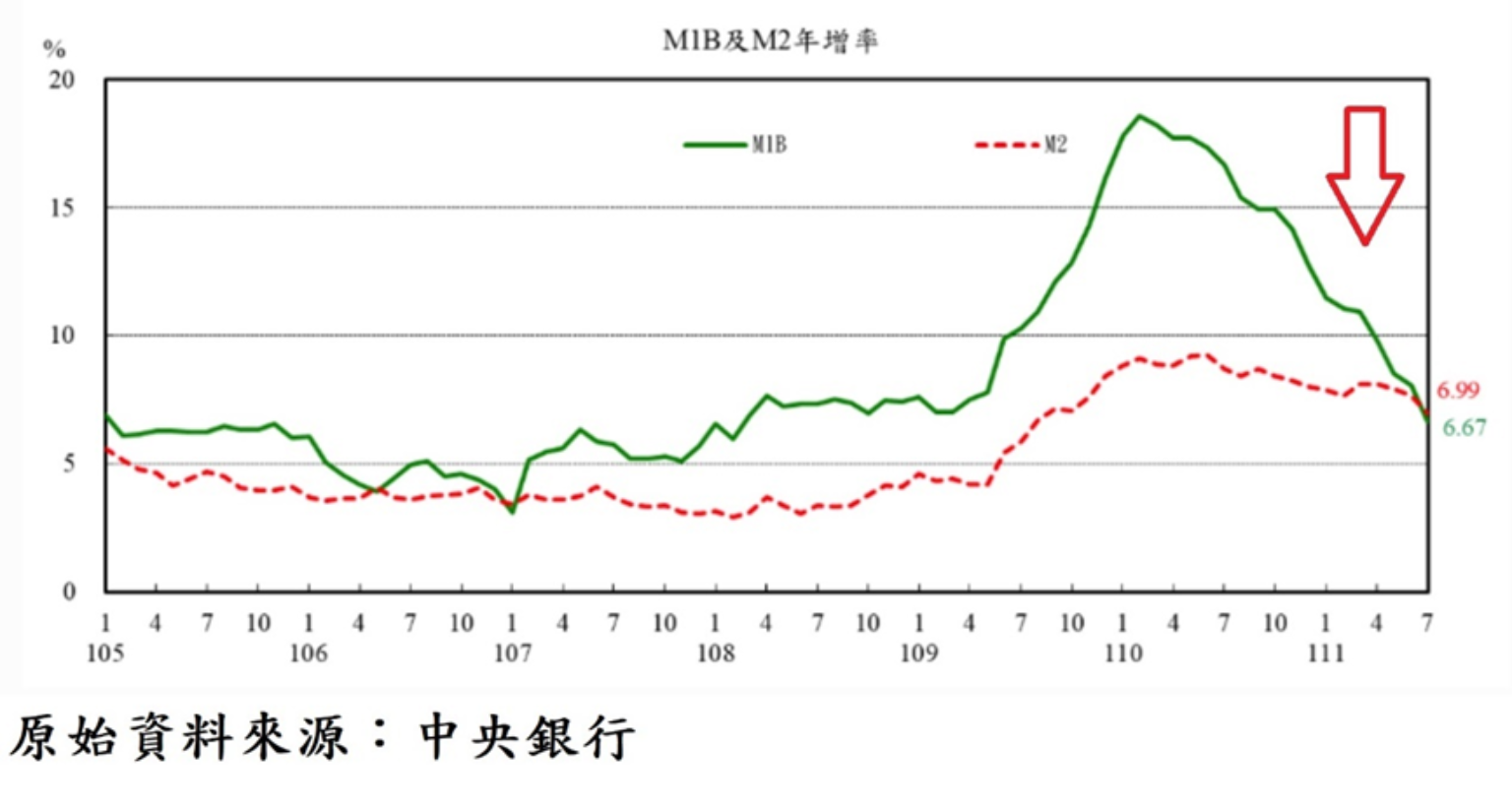 7月國內貨幣供給額M1B日平均總計數25.3456兆,M2總計數55.6668兆,代表廣義貨幣供給額的M2總計數連續第32個月創新高後首度回落,代表高度流動性的狹義貨幣供給額M1B較6月的25.4745兆下降,顯示國內資金整體水位自歷史高檔下降,高流動性、高變現性的活期性存款等狹義貨幣資金水位自2月的25.4989兆的歷史高檔下降趨勢仍持續之中。