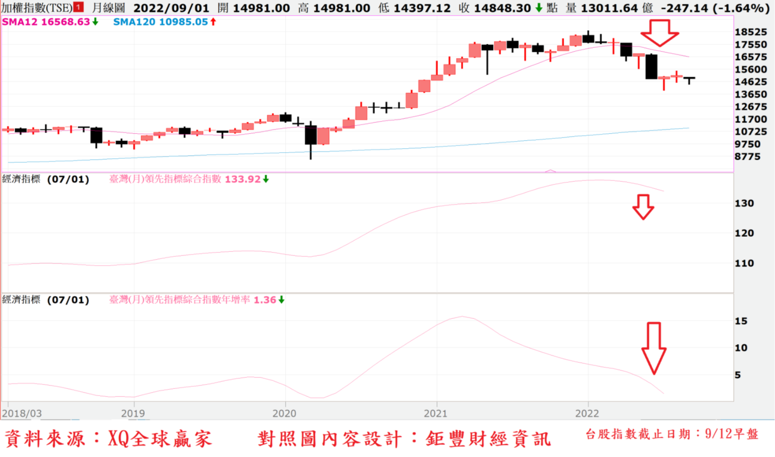 截至9月9日止,北海布蘭特原油每桶價格92.84美元,已明顯低於100美元關卡,CRB指數284.54點,自6月中旬以來的下降趨勢仍未改變,但仍在長期相對高檔區。加上美國10年期公債殖利率並未隨Fed主席鮑爾強硬的鷹派宣告,進一步突破6月中旬的年初來最高點3.5%,顯示全球總體經濟總額需求持續轉弱之中,代表全球經濟景氣將持續下行。