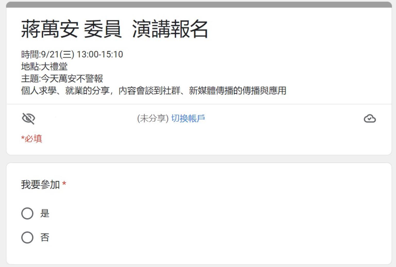 世新大學將於9月21日下午1時至3時邀請蔣萬安進行校園演講,主題是「今天萬安不警報」,分享他個人求學、就業的經驗,也會談及社群、新媒體的傳播與應用,觀眾名額為30人。