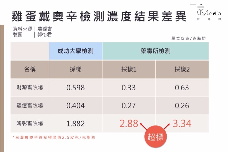 其實從毒理學來看,三家的數據在健康風險、統計上其實是沒有太大的差異,在超微量分析中,10倍的差異是很常見的,除非我們知道抽樣量夠大,具有統計上代表性的意義。今天只是鴻彰倒霉,過了2.5皮克/克脂肪的界線。因為我們不知道抽樣的蛋數量是否足夠代表整個養雞場。另外,我們吃的是全蛋,不是只吃蛋的脂肪,全蛋也把戴奧辛的量稀釋了,或是我們只吃蛋黃(如月餅、蛋黃酥),相對的攝取量也會提高。