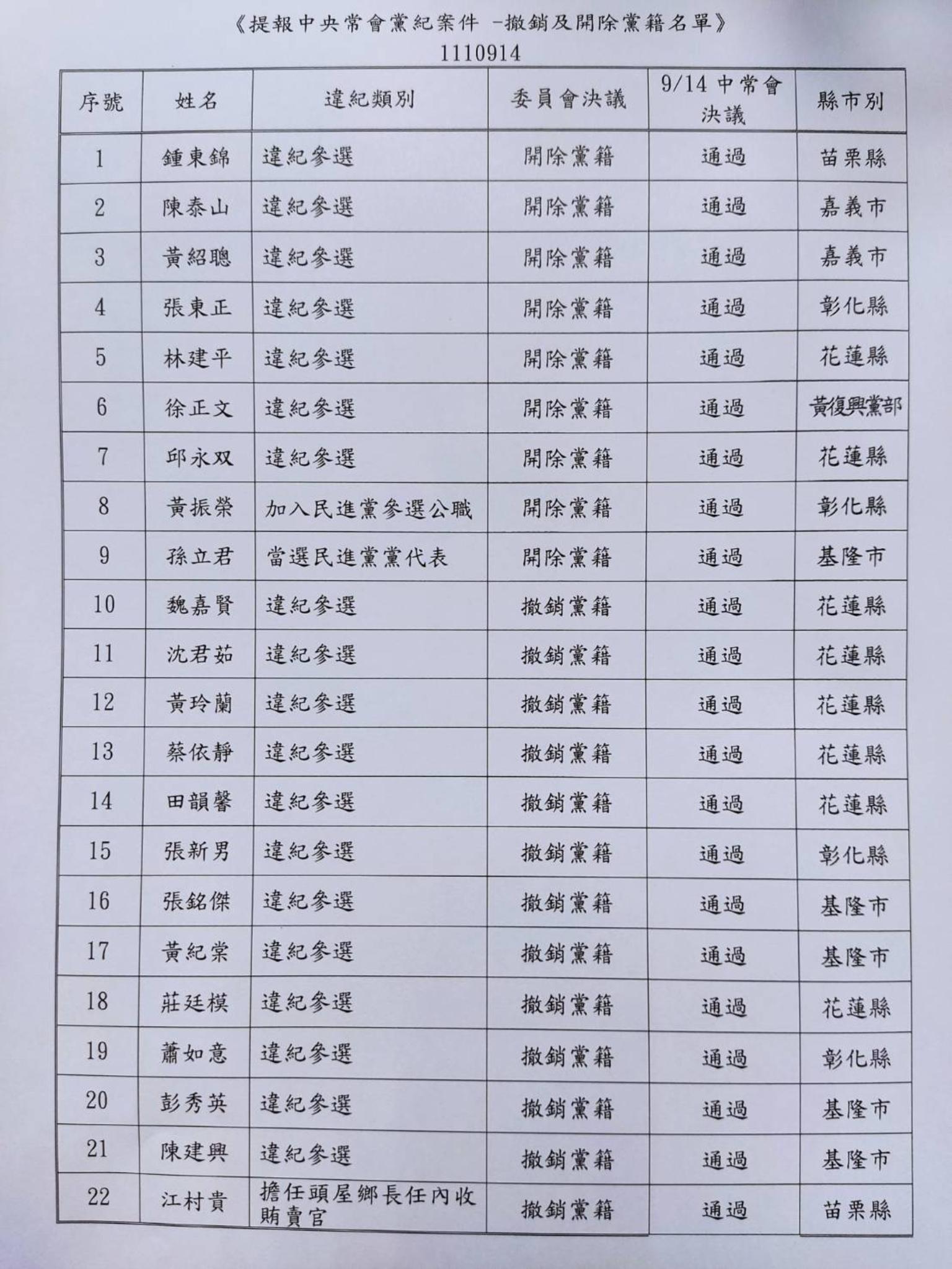 國民黨中常會今(14)日通過考紀會提出之考紀案,開除黨籍9人、撤銷黨籍13人,一共22人遭到黨紀處分。