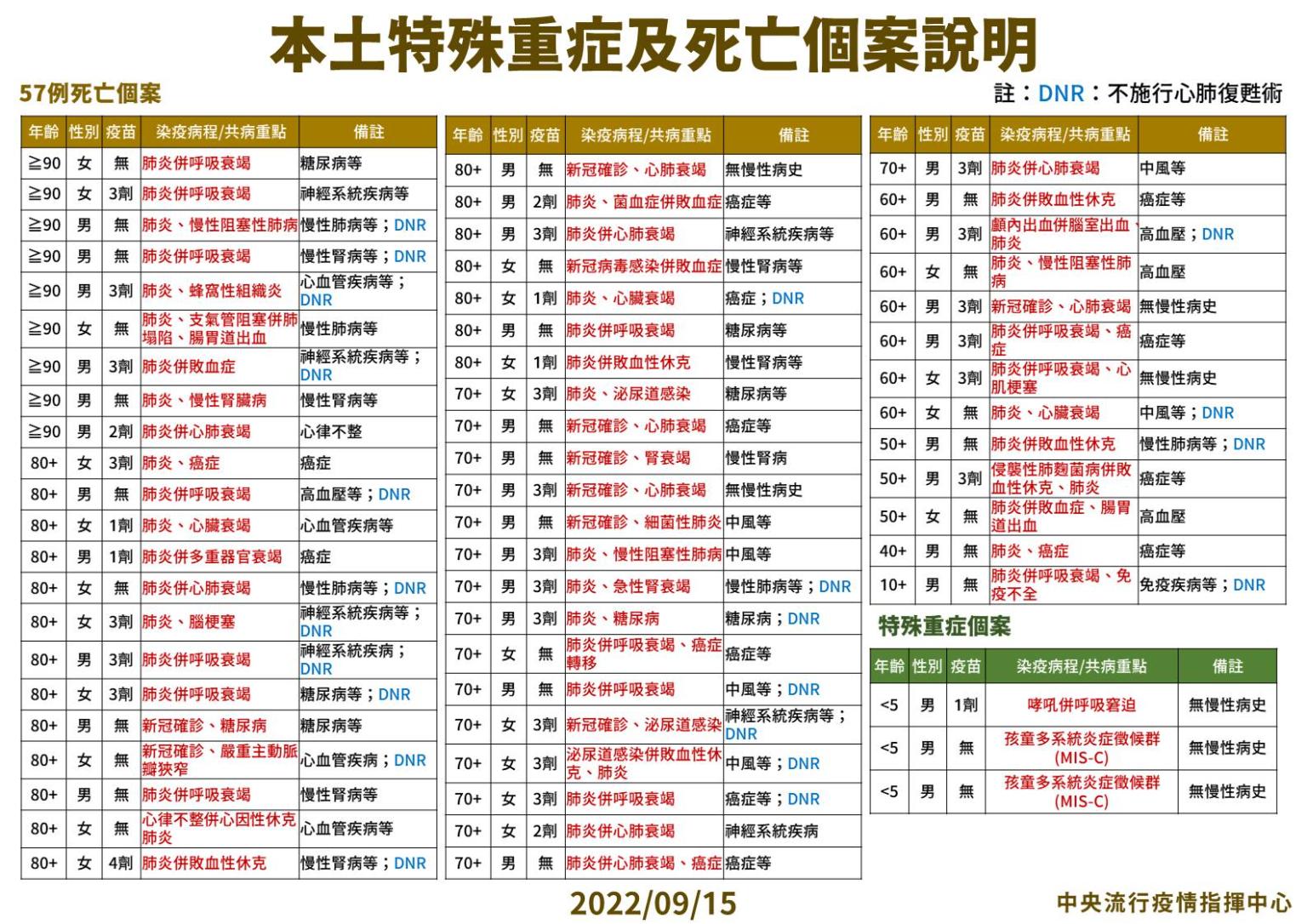 指揮中心指出,今日新增57例本土病例死亡個案,為33例男性、24例女性,年齡介於10多歲至90多歲以上,皆屬重度感染、53例具慢性病史、34例未接種3劑以上COVID-19疫苗。確診日介於今(2022)年5月19日至9月12日,死亡日期介於5月20日至9月12日,詳如新聞稿附件。