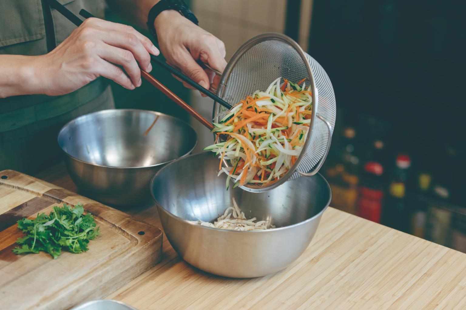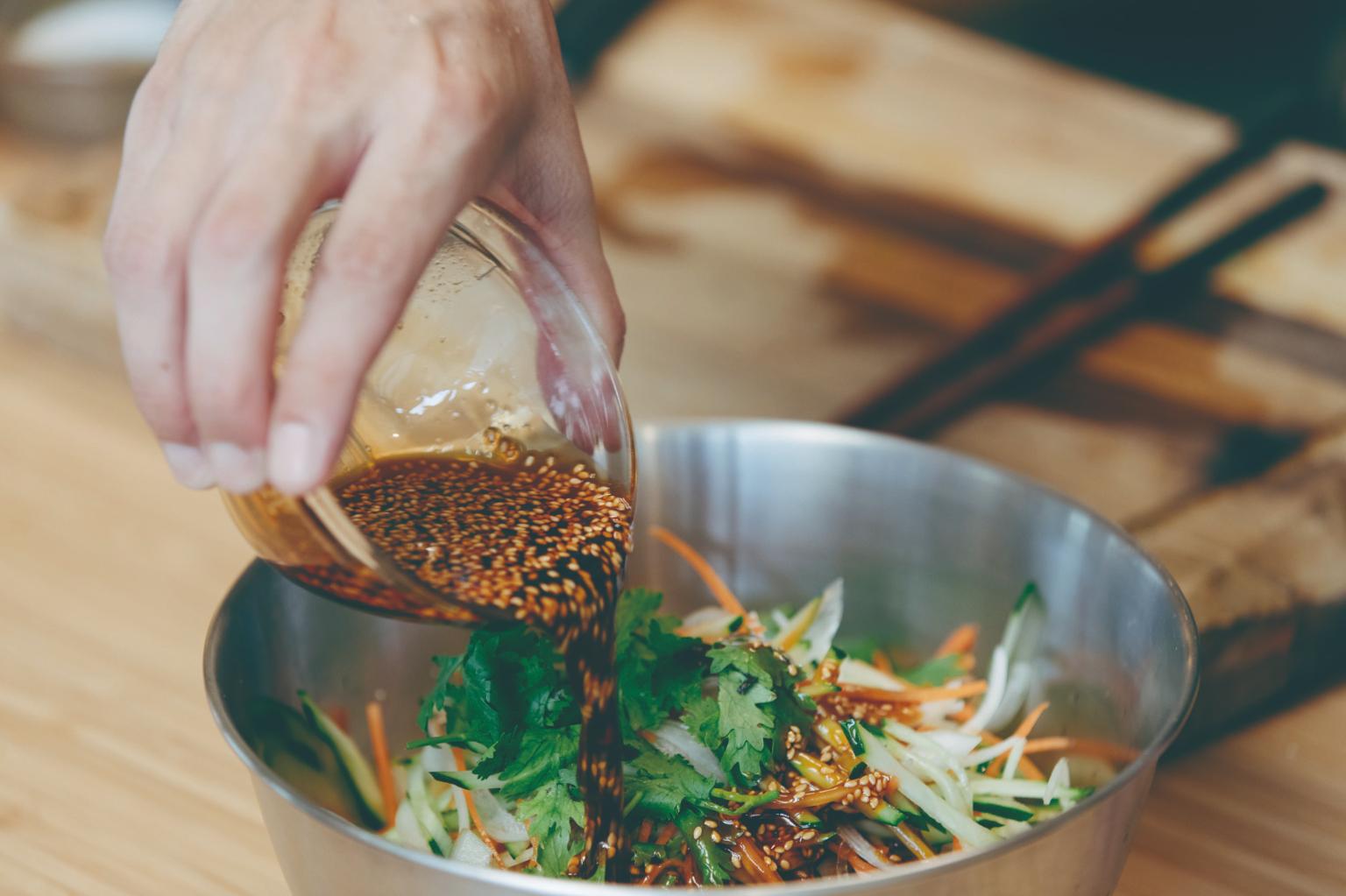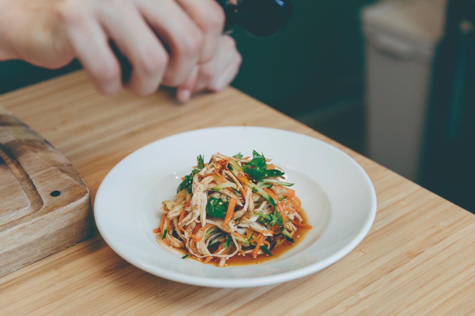 食材在經過初步調理後,接著可調製不同風味的拌醬,為涼拌料理增添層次。Ayo表示,食材與蘸醬的搭配並無定制,而是視料理風格而定,像是以花椒鹽醃漬過的雞胸肉,本身帶有中式風味,便可再以醬油、味醂、烏醋、辣油、麻油等混合成的拌醬來調味,製成香氣飽滿、爽麻涮嘴的「涼拌蔬菜雞絲」;若是想製作泰式涼拌雞丁或海鮮,則可以紅蔥頭末、香菜、魚露、檸檬汁、糖、辣椒混合成醬料做搭配,引領出酸香勁辣的好滋味。