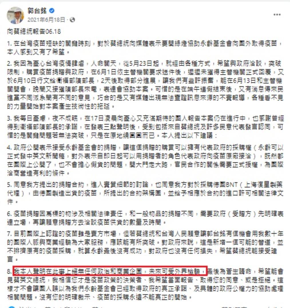 永齡基金會對此未做出評論,不過,郭台銘在去年6月18日,曾因採購疫苗時,「關鍵問題無法突破」,發表「向蔡總統報告」8點聲明,請求面見蔡英文。