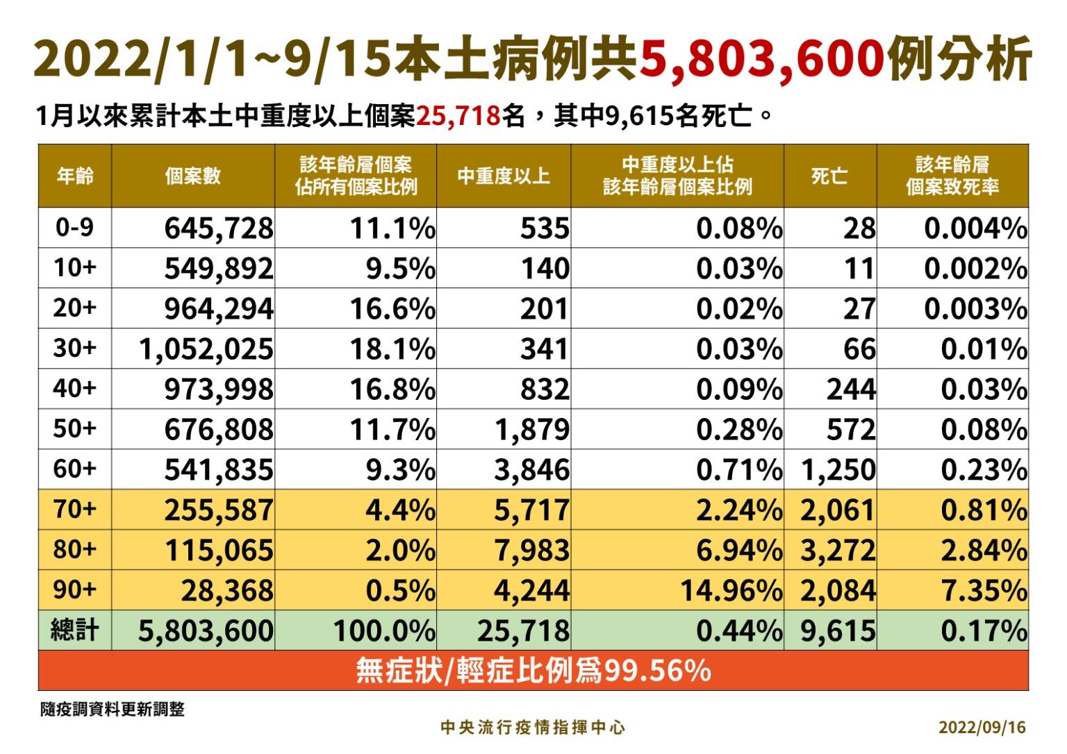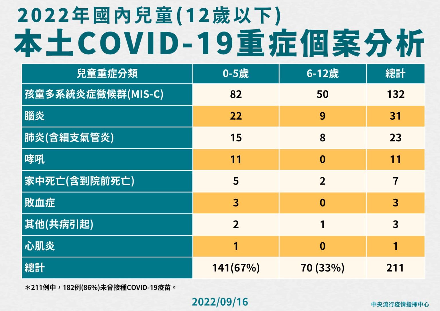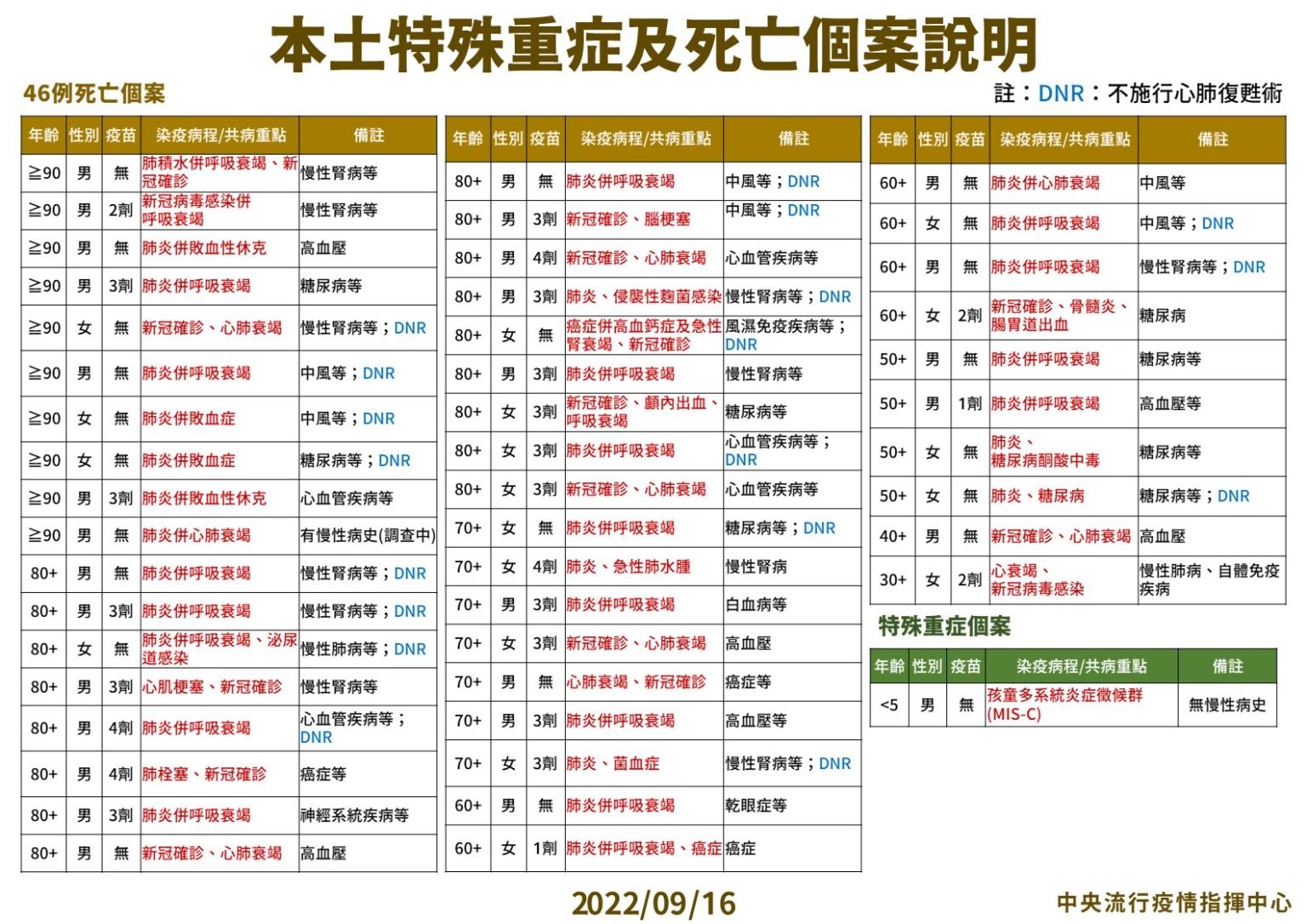 指揮中心指出,今日新增46例本土病例死亡個案,為28例男性、18例女性,年齡介於30多歲至90多歲以上,皆屬重度感染且具慢性病史、27例未接種3劑以上COVID-19疫苗。確診日介於今(2022)年7月20日至9月13日,死亡日期介於9月6日至9月13日。