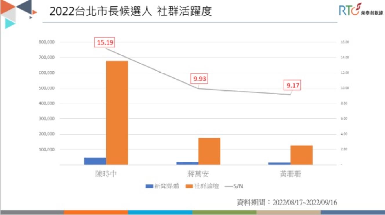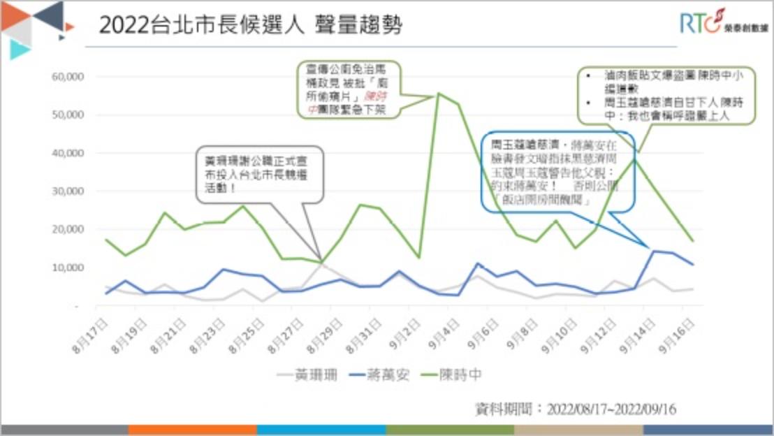而黃珊珊則於8月28日宣布卸任副市長公職,正式投入選戰,聲量來至其高點後,直到9月,其聲量一直未見提升。