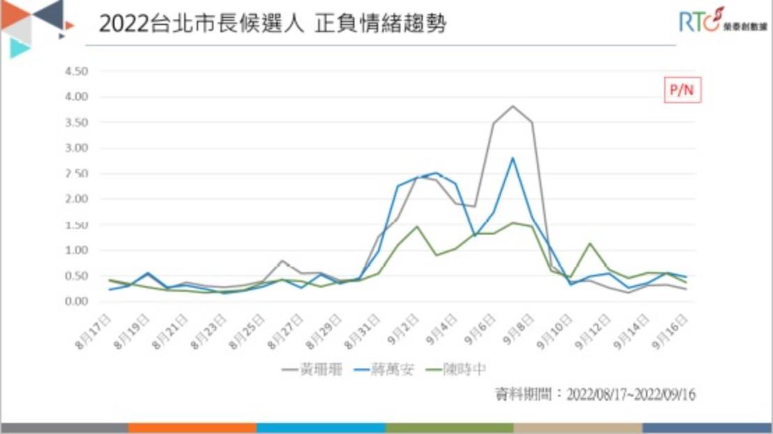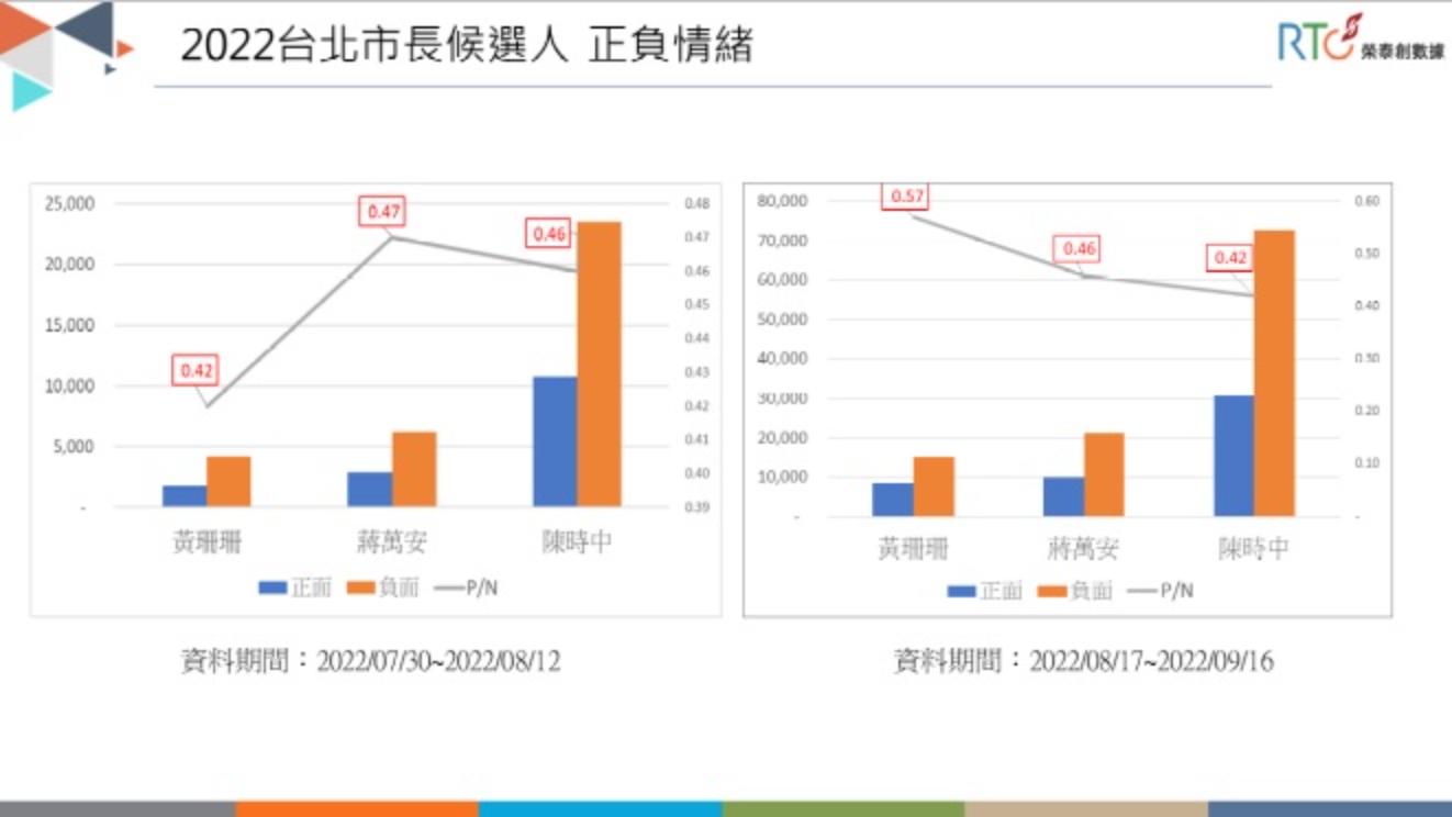 數據顯示,陳時中的正負情緒從8月的0.46,略降至0.42,國民黨參選人蔣萬安由0.47降至0.46。至於以無黨籍參選人黃珊珊變化最大,好感度由8月的0.42,在9月強彈至0.57,超車陳時中與蔣萬安。