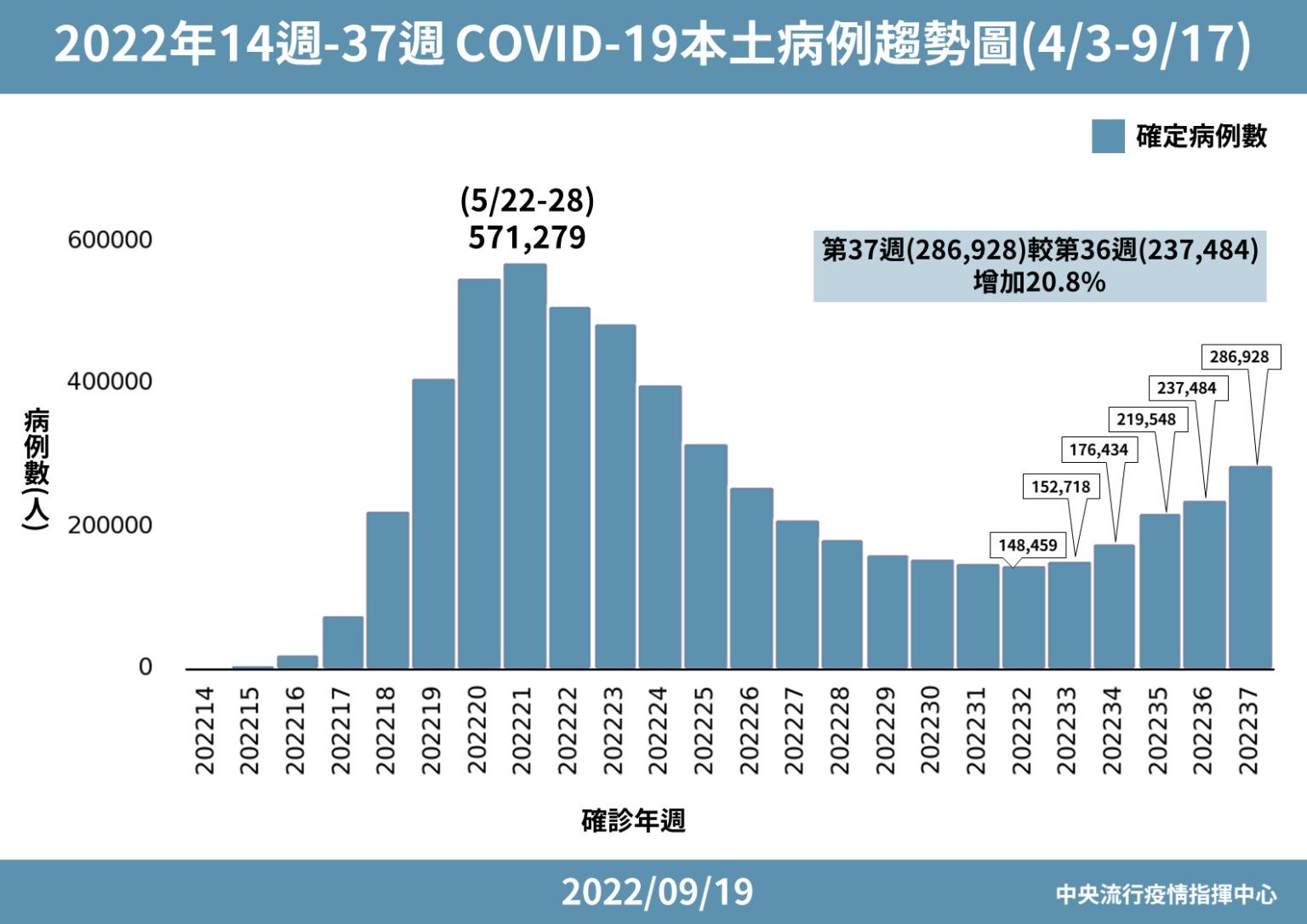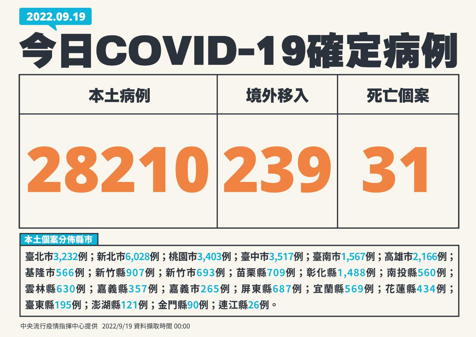 中央流行疫情指揮中心今(19)日公布國內新增28,449例COVID-19確定病例,分別為28,210例本土個案及239例境外移入;另確診個案中新增31例死亡。
