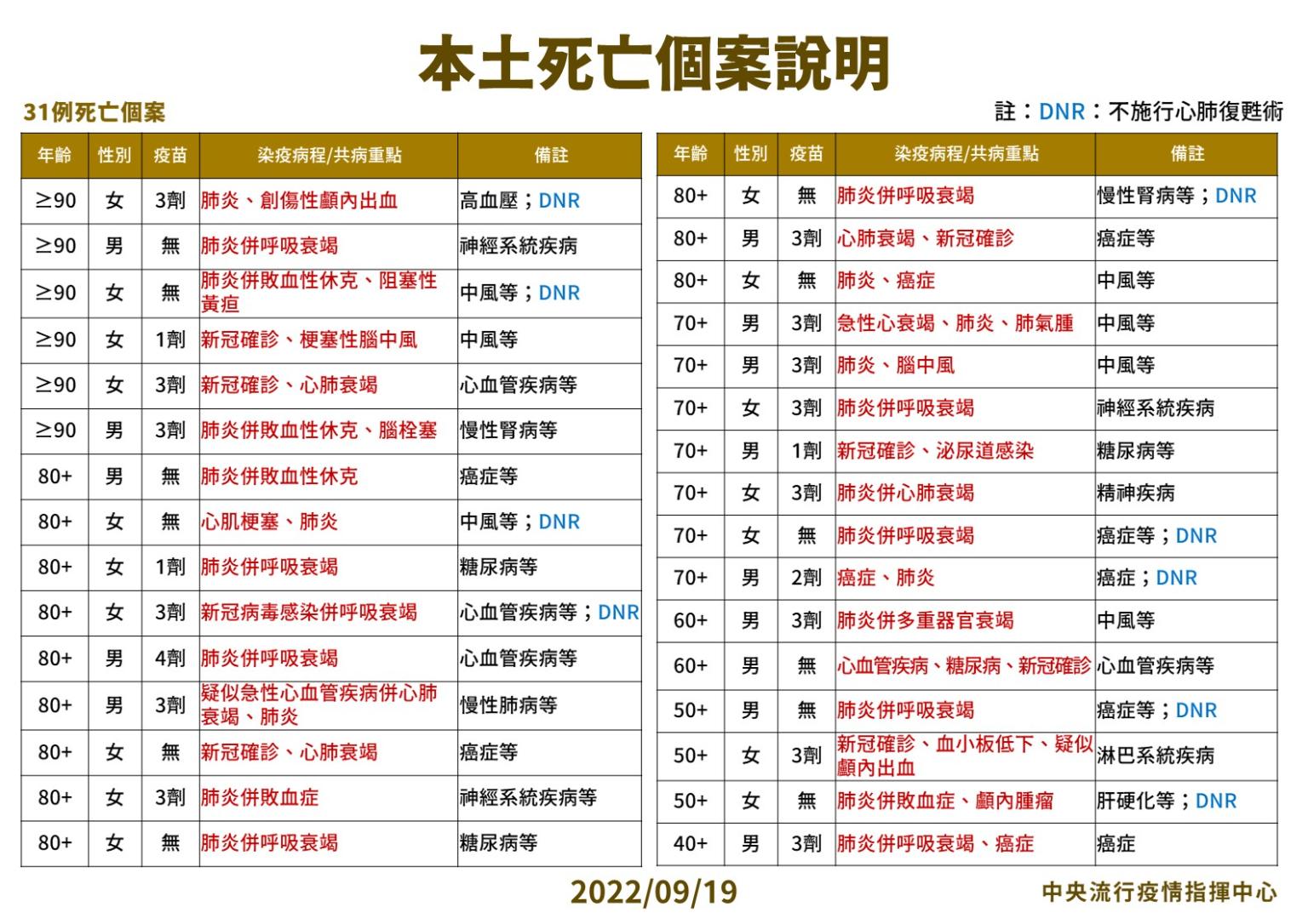 指揮中心指出,今日新增31例本土病例死亡個案,為14例男性、17例女性,年齡介於40多歲至90多歲以上,皆屬重度感染且具慢性病史、16例未接種3劑以上COVID-19疫苗。確診日介於今(2022)年8月12日至9月16日,死亡日期介於6月6日至9月16日。