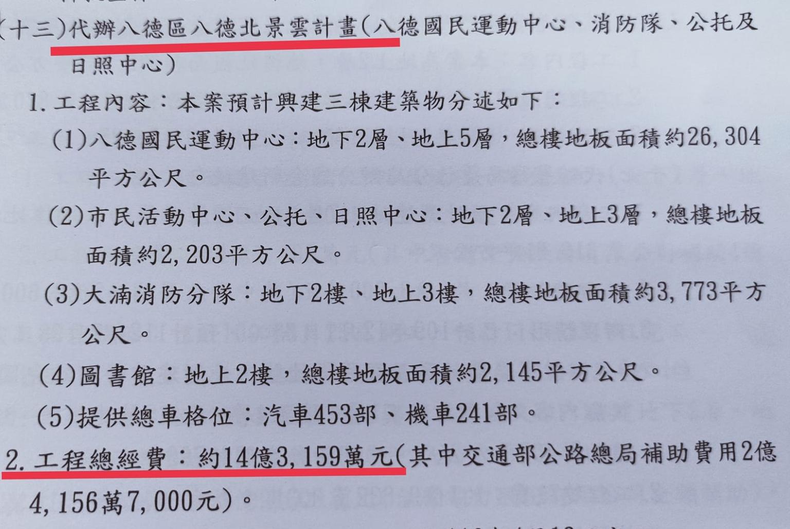 根據桃園市政府資料顯示,當初以「北景雲計畫統包工程」,辦理八德國民運動中心、桃園市大湳社福館、大湳消防分隊等3大複合式建築,總經費為12億5,536萬元,中央再另外提撥約2億元進行興建。