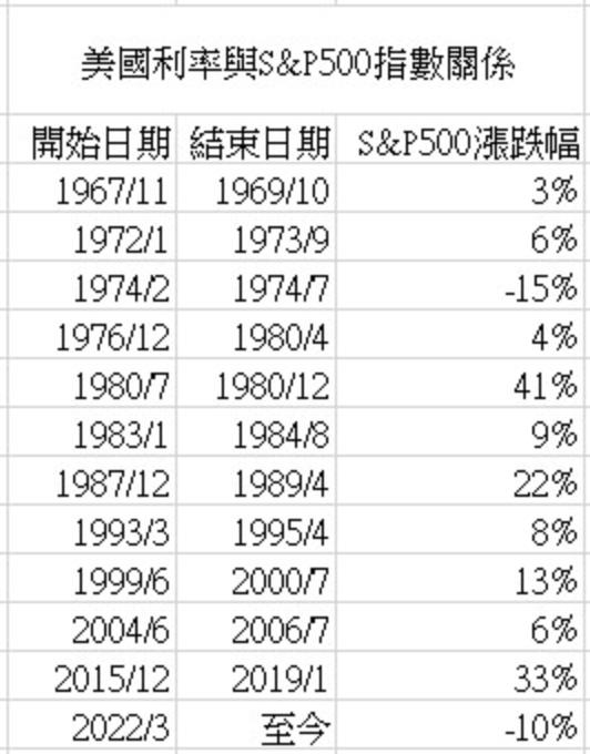 我們統計美國1967年開始升息與S&P500指數資料,發現美國過去(包含2022年這次)升息了12次,只有2次(包含還沒結束的這次)股市是下跌的,其他10次都是上漲的,因此過去歷史告訴我們利率提高,對股票市場更有利;小心為了降低升息導致虧損的機率,反而越避越險。