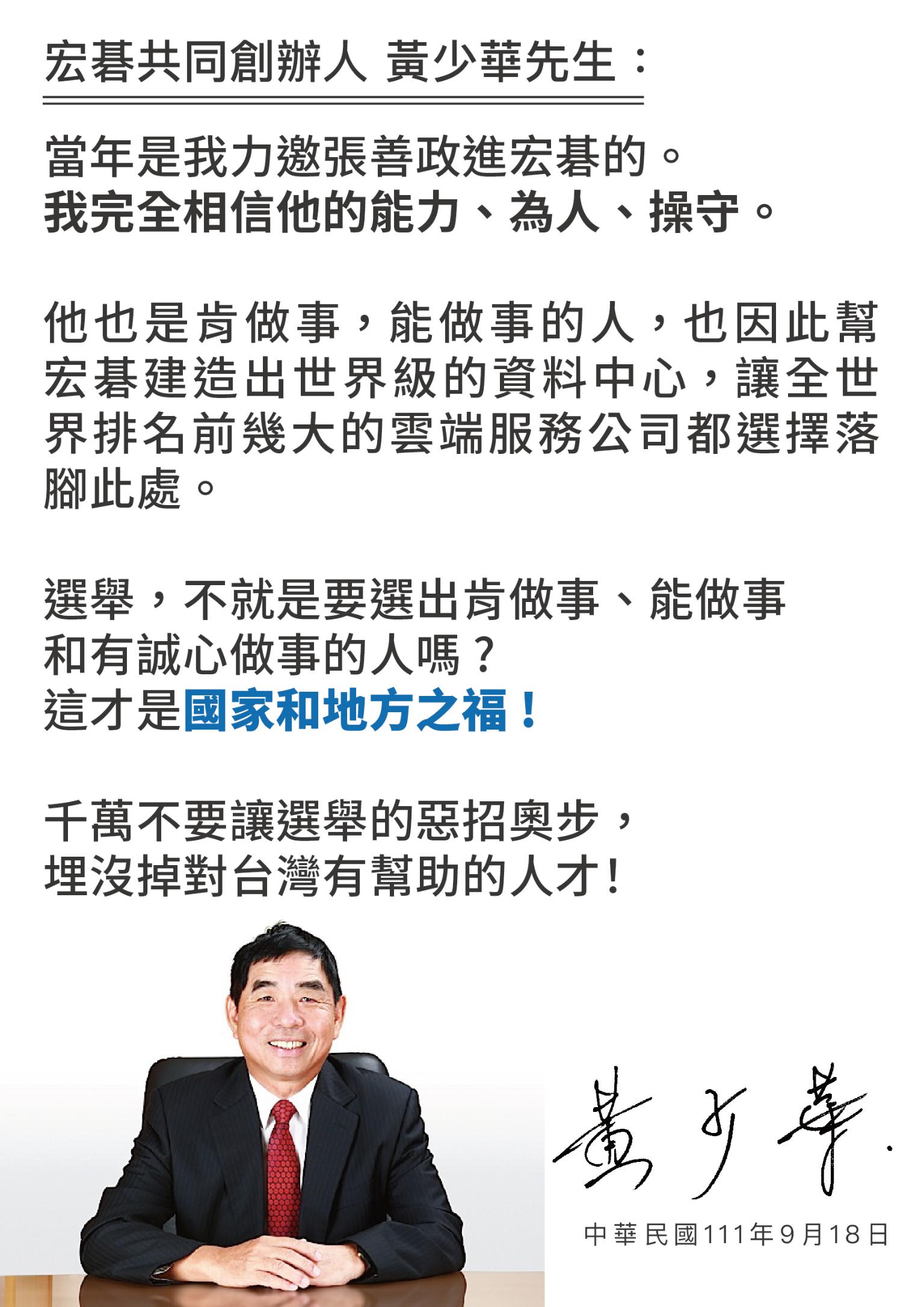 黃少華在聲明中強調,當年是他力邀張善政進入宏碁,完全相信張的能力、張善政是肯做事、能做事的人,也因此幫宏基打造世界級的資料中心,讓全世界排名前幾大的雲端資料中心都落腳此處,黃少華說,選舉不就是要選出肯做事、能做事為人、何有誠心做事的人嗎?千萬不要讓選舉的惡招奧步,埋沒掉對台灣有幫助的人才