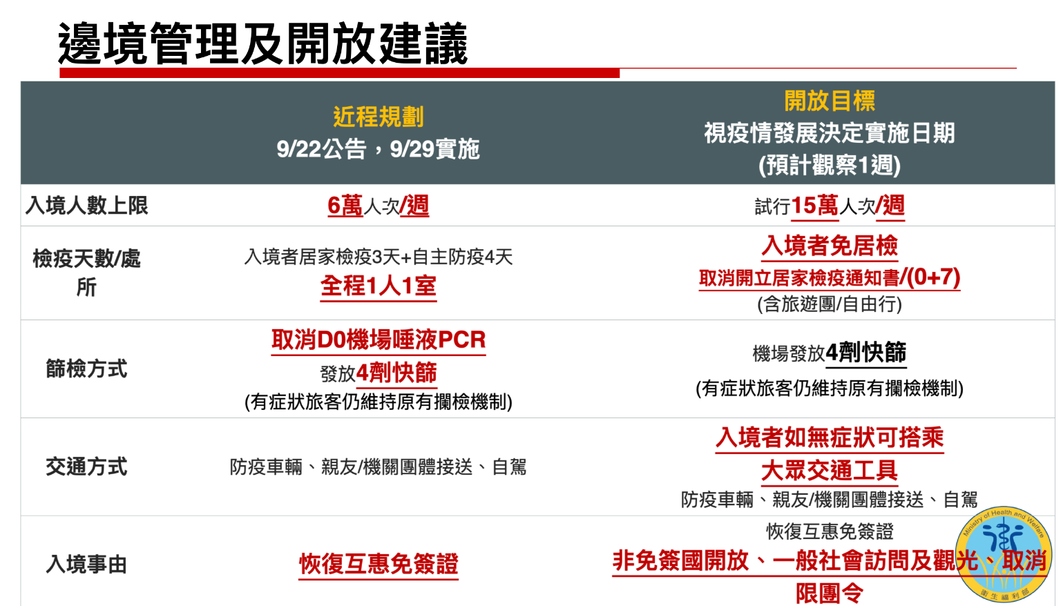 台灣將迎向邊境解封!流行疫情指揮中心今(22)向行政院提報二階段解封計畫,9月29日起將開放每週6萬人免簽入境,居隔3+4改一人一室。觀察兩週後,第二階段在10月13日實行0+7措施,也就是入境台灣免隔離政策。