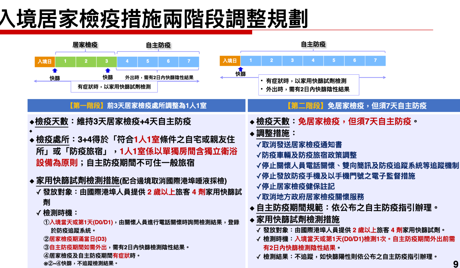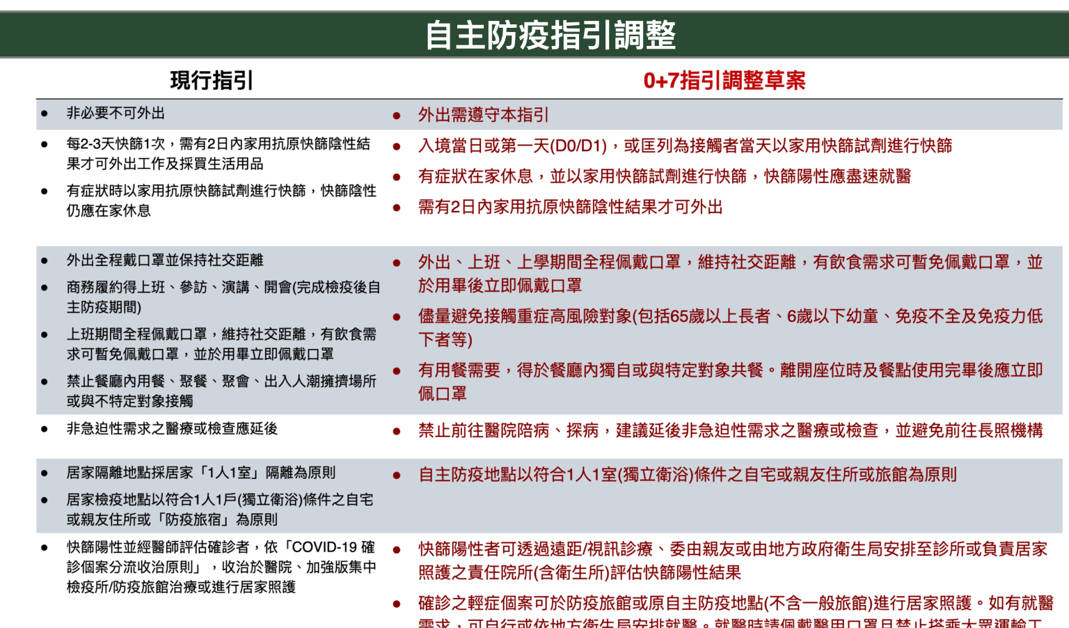 流行疫情中心指揮官王必勝表示,為了因應0+7免居隔解封,未來也會停止發放居家檢疫通知書,還有調整防疫車輛派送、自主防疫指引也會配合解封調整。以前是要大家不要外出,未來如果要外出,只要配合指引即可,像是要有兩天內的陰性快篩才能外出;如果用餐需要可以拿掉口罩,用餐後續繼戴上口罩。至於確診者部分,王必勝說,經過自我篩檢後陽性的確診者,如何處理也有安排。
