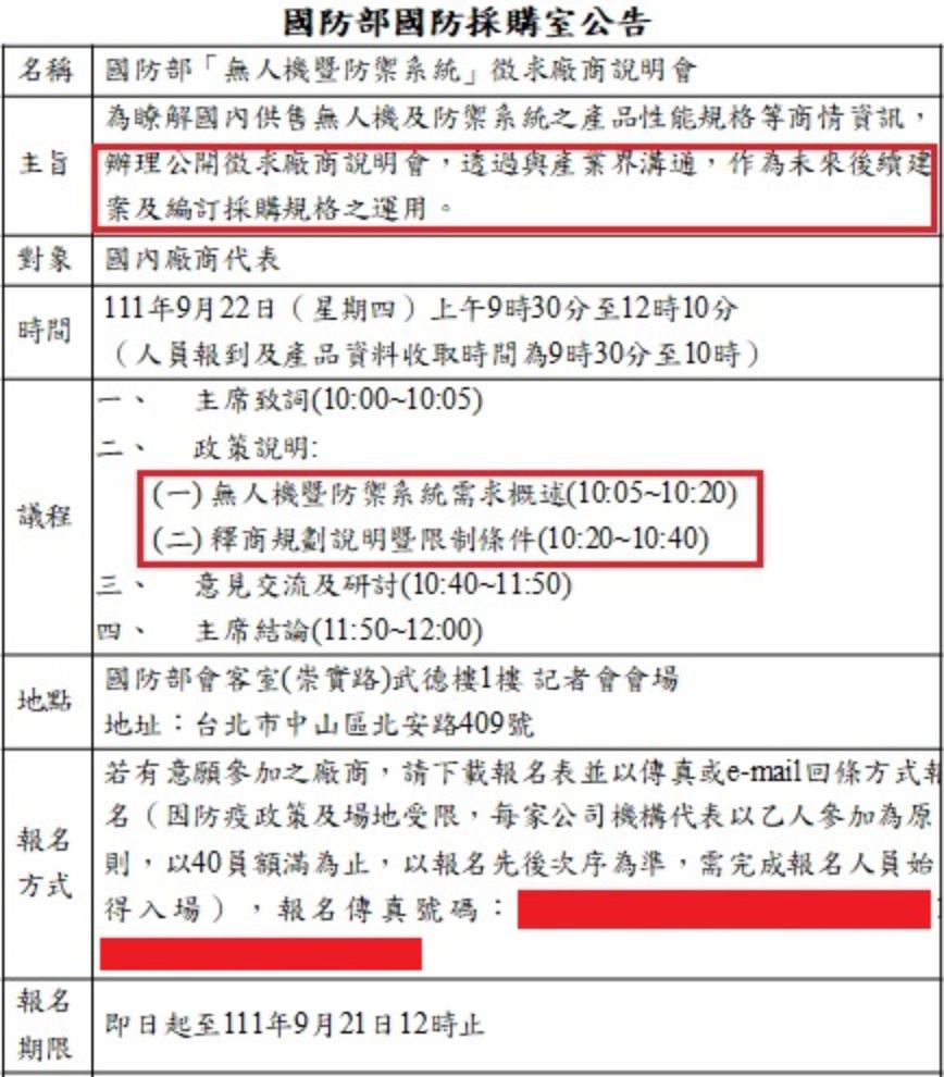 國防部在這樣尷尬的氛圍下,為展開下一階段釋商布局,於今日召開「無人機暨防禦系統」徵求廠商說明會。