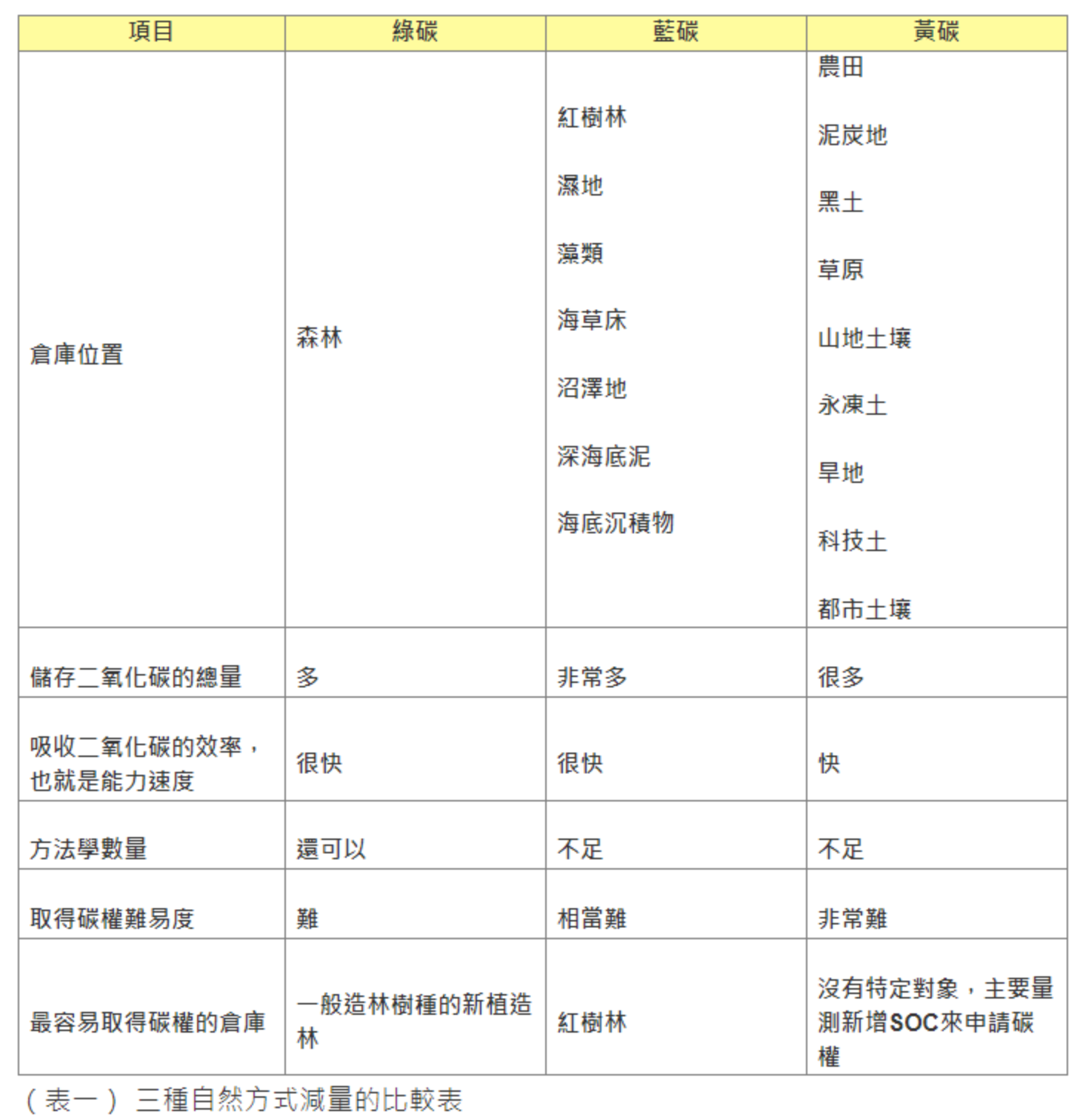 有這樣能舉一反三的讀者學生真是令人欣慰!還記得之前文章我整理的這張表嗎,在藍碳的部分確實有提到藻類與海草床。