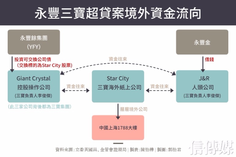 問題來了,黃國昌表示,同時因為永豐金又透過孫公司GC借款給三寶建設蓋上海1788大樓。換句話說,何壽川身為永豐餘集團總裁和永豐金控董事長,卻左手購買三寶集團的可交換公司債,右手超額放款給三寶集團,是否涉及利害關係人交易?