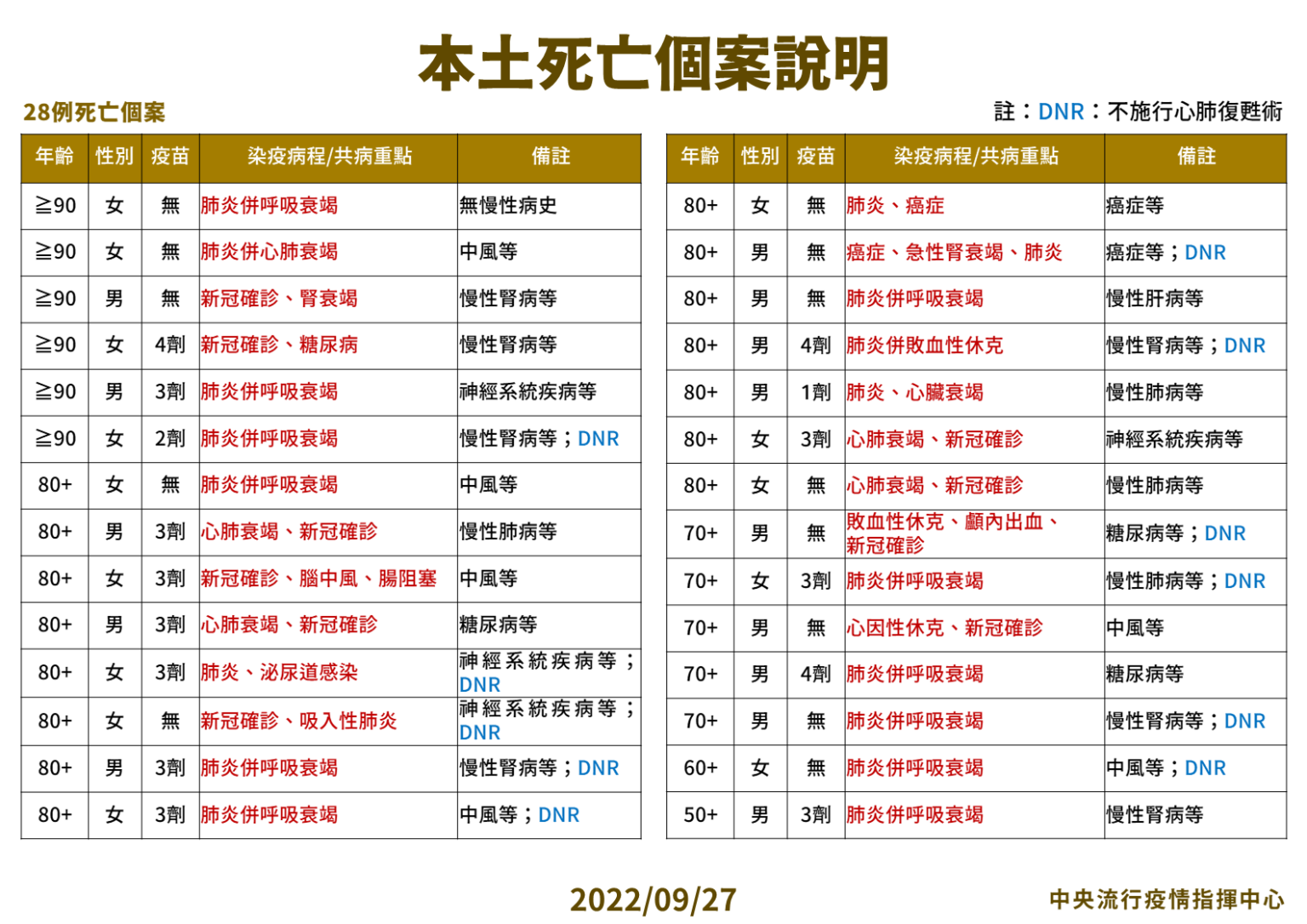指揮中心指出,今日新增28例本土病例死亡個案,為14例男性、14例女性,年齡介於50多歲至90多歲以上,皆屬重度感染、27例具慢性病史、15例未接種3劑以上COVID-19疫苗。確診日介於今(2022)年9月4日至9月23日,死亡日期介於9月14日至9月24日,詳如新聞稿附件。