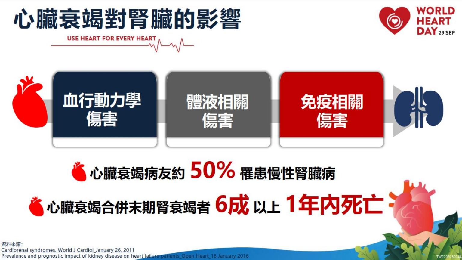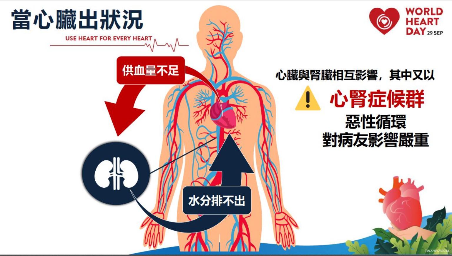 黎思源解釋,心臟與腎臟兩者的關係相當密切,心臟疾病因供應腎臟的血液不足會導致腎臟病變,腎臟疾病也會因體液與電解質不平衡使得心臟負擔增加,稱為「心腎症候群(Cardiorenal Syndrome, CRS)」,而大多數的透析病友對心腎症候群並不熟悉,容易輕忽心臟衰竭共病的嚴重性。