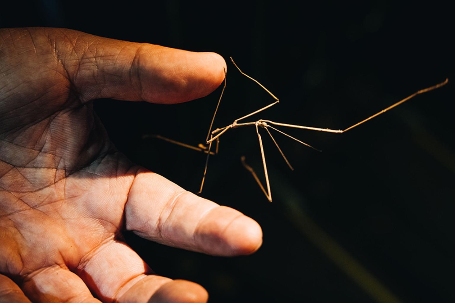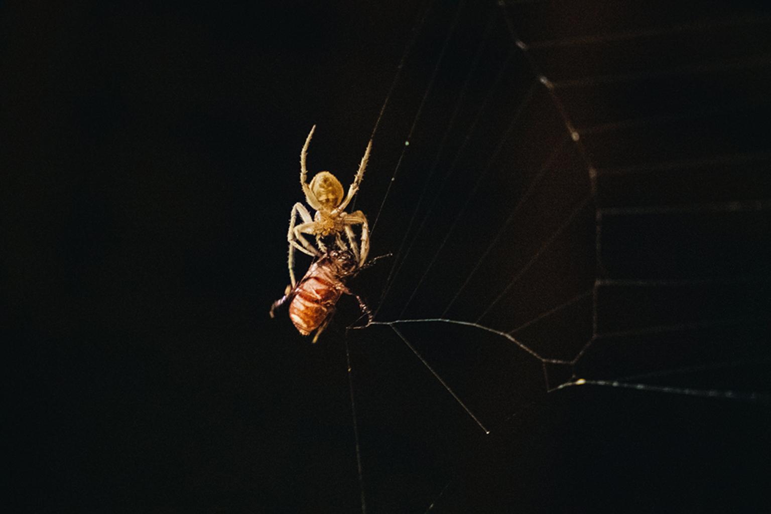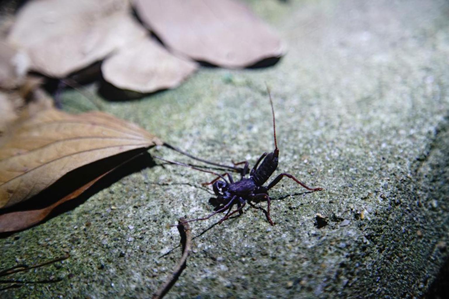 木棧道上,外形像蠍子但沒有毒性的鞭蠍正好路過,高高翹著和門神手上武器一樣的「鞭」尾巴,廖老師開玩笑地補充:「鞭蠍會抓蟑螂喔!家裡要不要養一隻?」聚光焦點轉移到結好網的野姬鬼蛛,忽然,一隻金龜子自投羅網,只見鬼蛛迅速爬向被黏住而動彈不得的金龜子,一邊注入毒液,一邊吐絲,嘗試以蜘蛛絲包捲金龜子,尚留餘力金龜子垂死掙扎,雙方一陣你來我往,最後竟然成功脫逃,眾人一陣驚呼後,廖老師為這場驚心動魄的決戰森林生死秀下結論:「野生動物的日常只有兩件事,第一是吃別人,第二是躲起來避免被吃。」