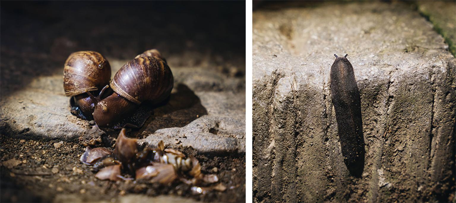 從龍泉寺登山口出發,踩著夜色,揭開北壽山夜間生態樂園,沒走多遠,廖老師忽然停下腳步,手電筒照向一張結構完整的大型蜘蛛網說:「這種蜘蛛白天都在睡覺,晚上出來結網,跟鬼一樣,所以叫牠茶色姬鬼蛛。」幽默風趣的介紹,讓我們立刻記住蜘蛛特徵,「仔細看鬼蛛的肚子有三個小點,是不是很像小丑的臉!」彷彿內建生物動態感測器,廖老師一轉身又發現兩隻正在交配的非洲大蝸牛,和皺足蛞蝓緩慢前進,竹節蟲則攀附樹枝,隨風輕輕搖晃,真假難辨,不愧是自然界的偽裝高手。