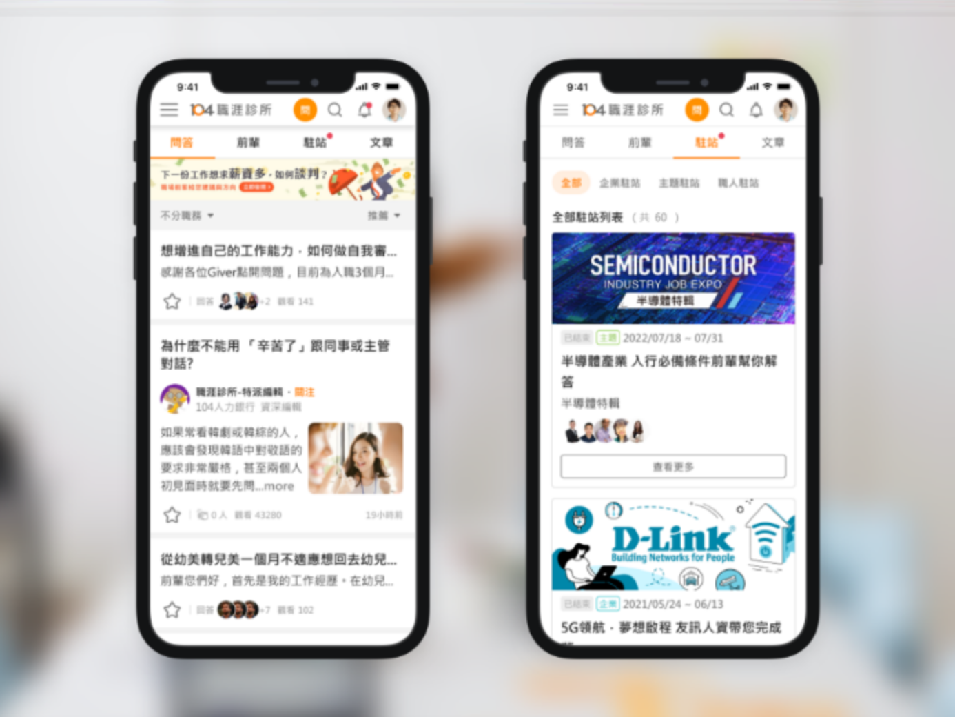 為了幫助對職場感到困惑的年輕人,104人力銀行打造職場問答平台—職涯診所,讓Giver(職場前輩)與職涯迷惘的提問者在線上相遇,也讓跨產業與跨領域的知識都能進行共享與交流,幫助新鮮人與職場工作者找到未來職涯方向。