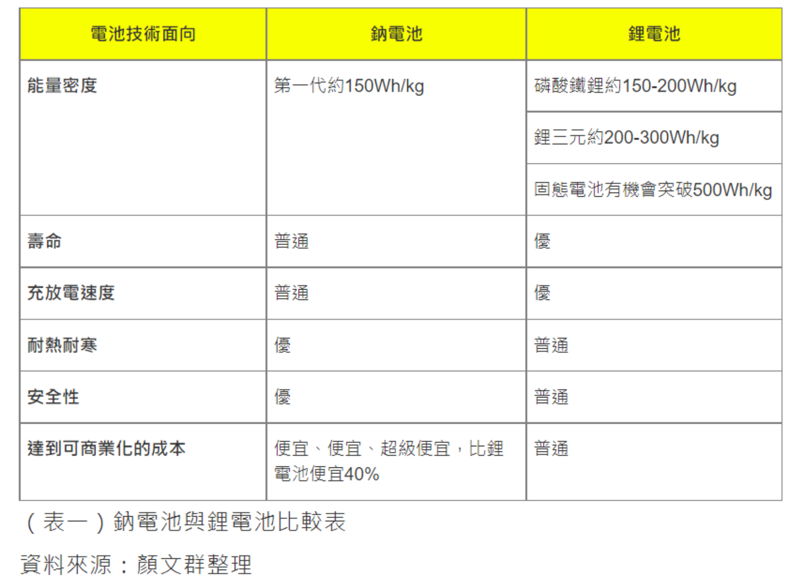 我們之前談過六個判斷電池技術潛能的基本邏輯:能量密度高、壽命長、充放電速度快、耐熱耐寒、安全性高、達到可商業化的成本。讓我們用下表來比較鈉電池與鋰電池在這六個面向的戰力: