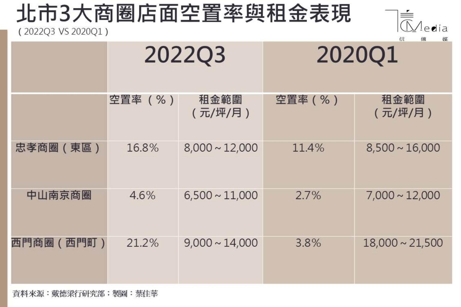 根據戴德梁行統計台北市3大商圈(忠孝商圈、中山南京商圈、西門商圈)第3季空置率表現,其中,俗稱東區的忠孝商圈店面空置率與上季較為持平,空置率維持在16.8%;中山南京商圈店面則持續去化,空置率下探到4.61%。