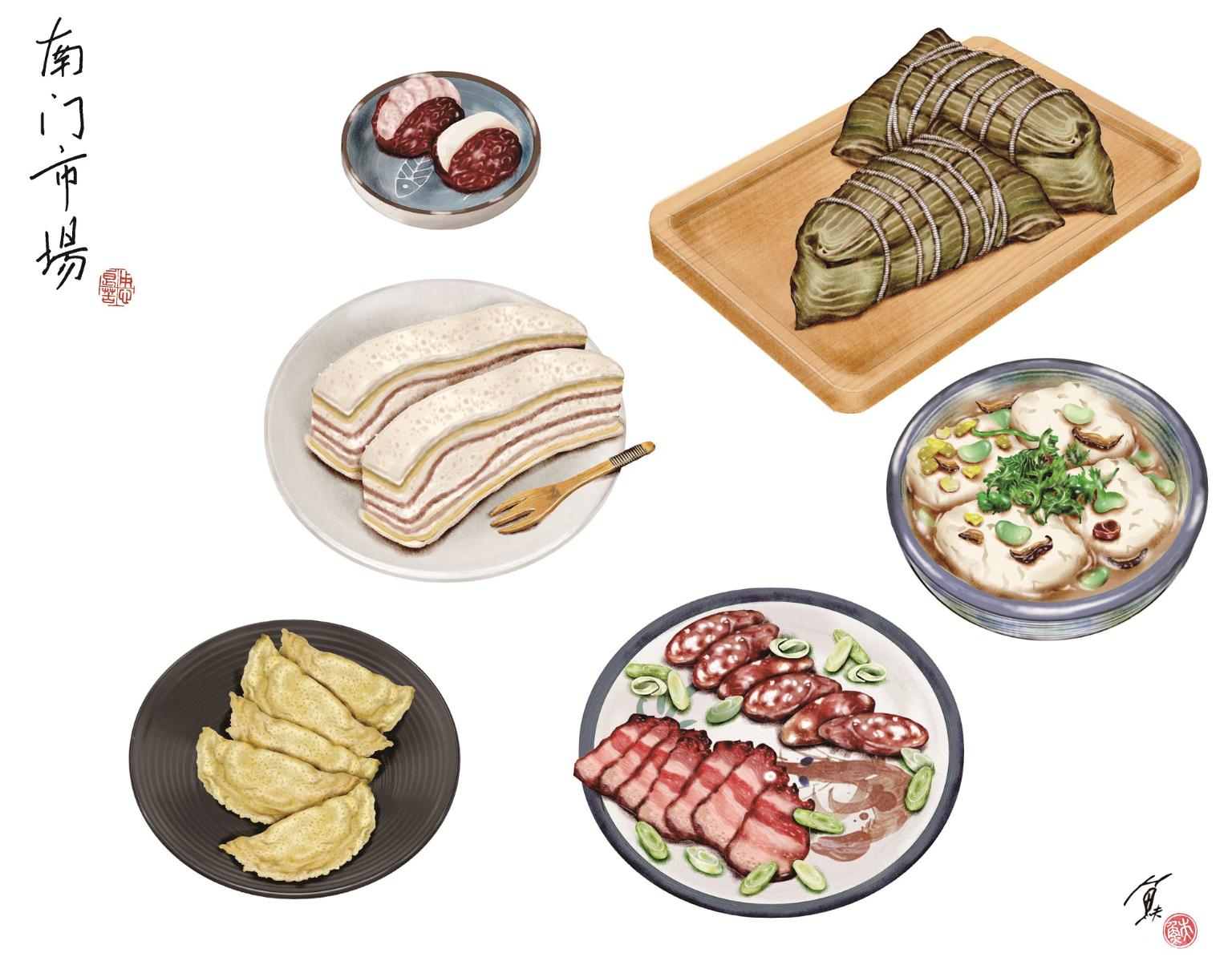 1944年創立的「徐家點心」則是台灣點心的古早味,其中千層饅頭最為膾炙人口;販售南北雜貨的「常興食品商店」在地經營超過四十年,福州紅糟、四川涪陵榨菜、埔里香菇、桂花醬、酒釀,乃至於包肉粽所需食材等應有盡有,品項達三百多項,還有「福泰和」、「常興」、「協盛」、「南門醬園」等也都是南北雜貨的大店家。而用新鮮黑豬後腿肉為內餡,搭配純蛋液外皮的「南門魚丸店」蛋餃,在市場裡也占有一席之地,是許多饕家的最愛。