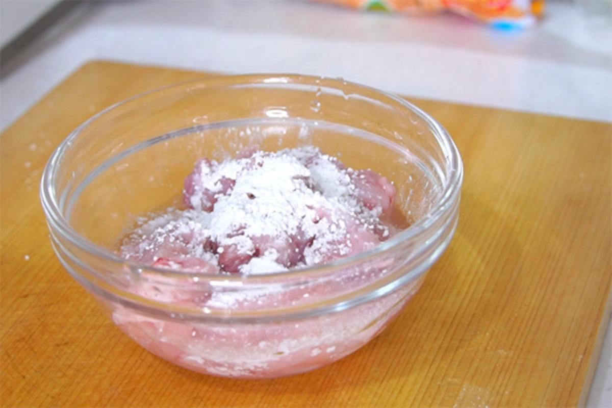 將豬腿肉切片後,加入一點太白粉與米酒醃漬5分鐘。