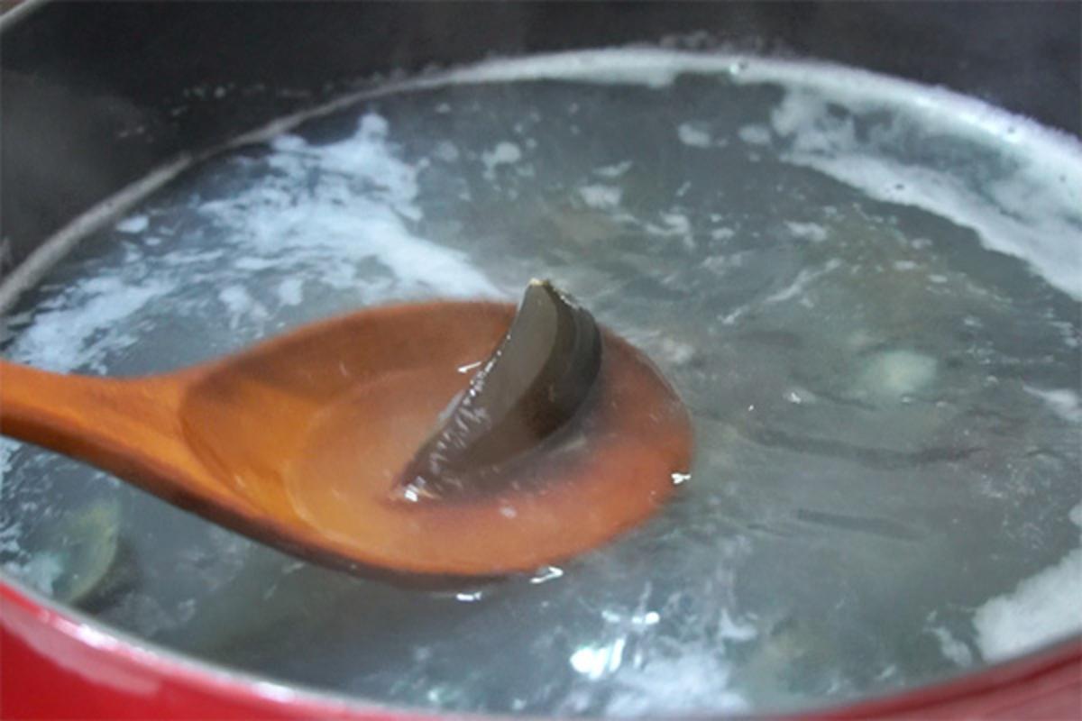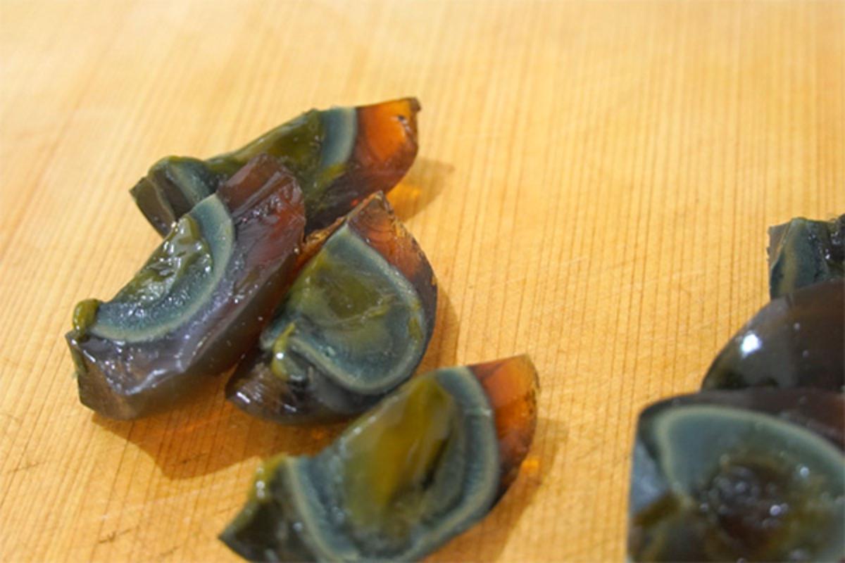 取湯鍋煮1200cc水,水滾後加入2塊排骨湯快做高湯。加入皮蛋煮約10分鐘,將皮蛋鮮香為煮出。