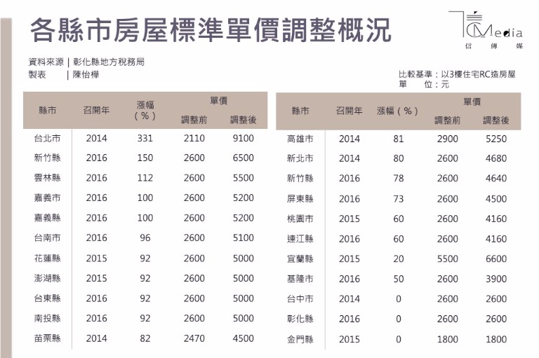 從2012年開始,宜蘭縣率先調高房屋標準單價,之後台北市、新北市、高雄市、苗栗縣也跟著在2014年調整。隔一年2015年,桃園市、花蓮縣、澎湖縣也調整房屋稅,而2016年時包括台南市在內的12個縣市都召開不動產評價委員會,市場一度預期從今年起全台灣都將全面調高房屋稅。
