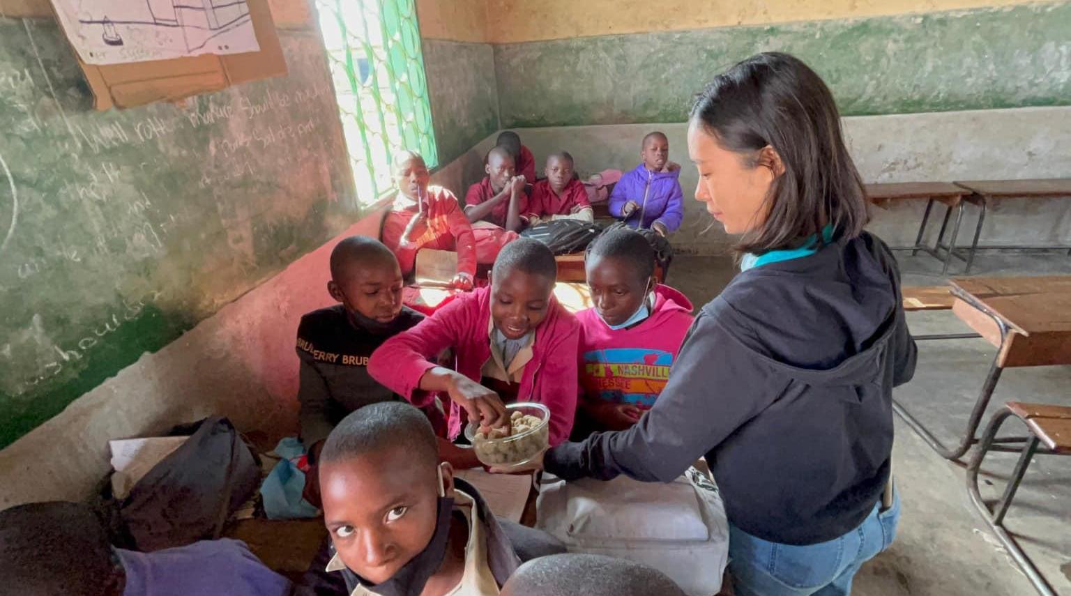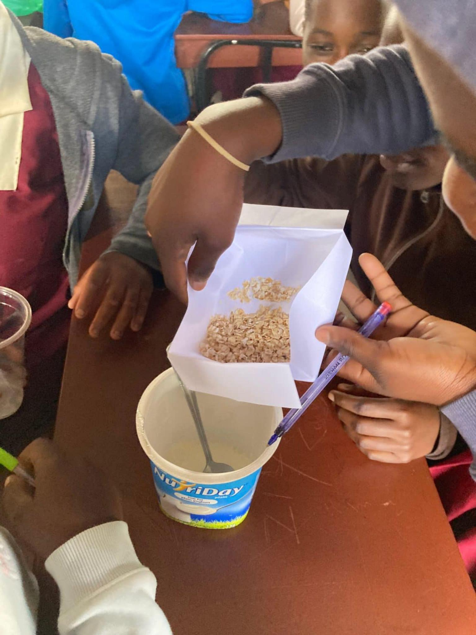 團員教導當地學生認識全穀物,包括定義和識別馬拉威常見的全穀物,「我們還分享了April經常吃且美味稱做『隔夜燕麥』的美國全麥食品自製食譜,讓孩子們在課堂上自己製作,結果燕麥食譜在學生中大受歡迎,他們很投入我們設計的教學活動!」